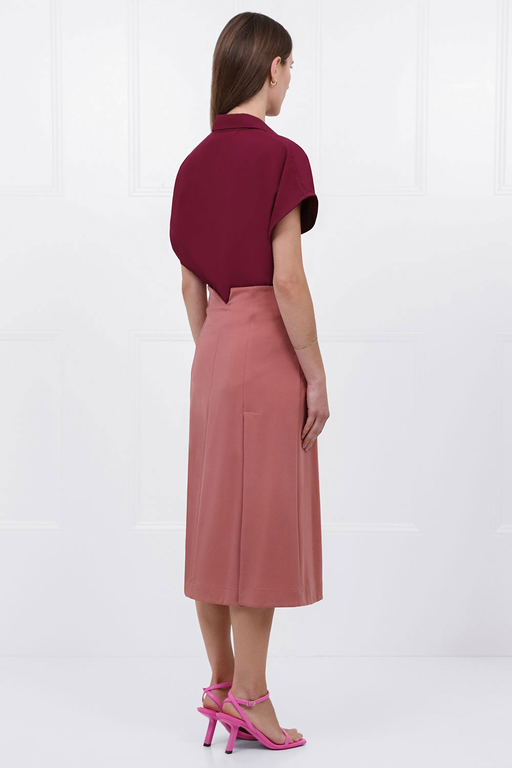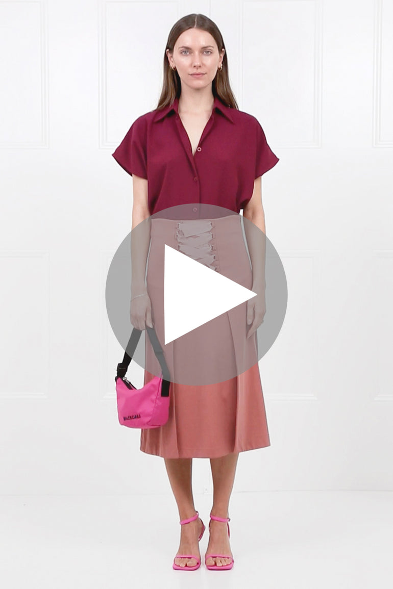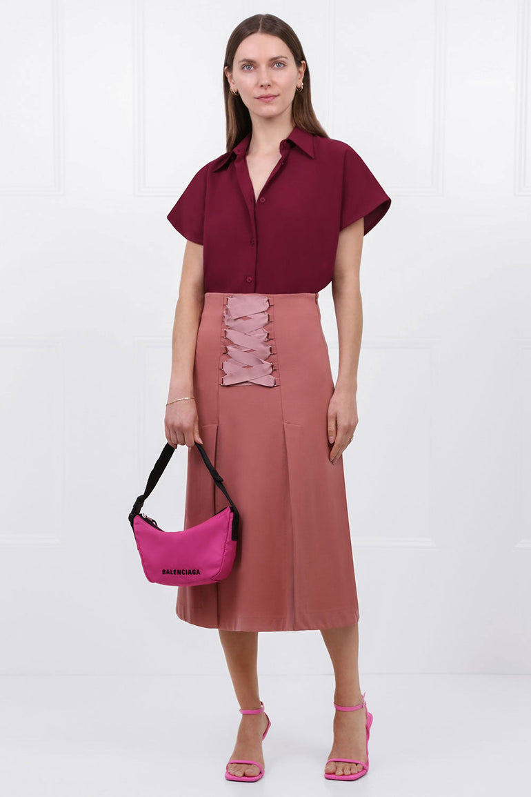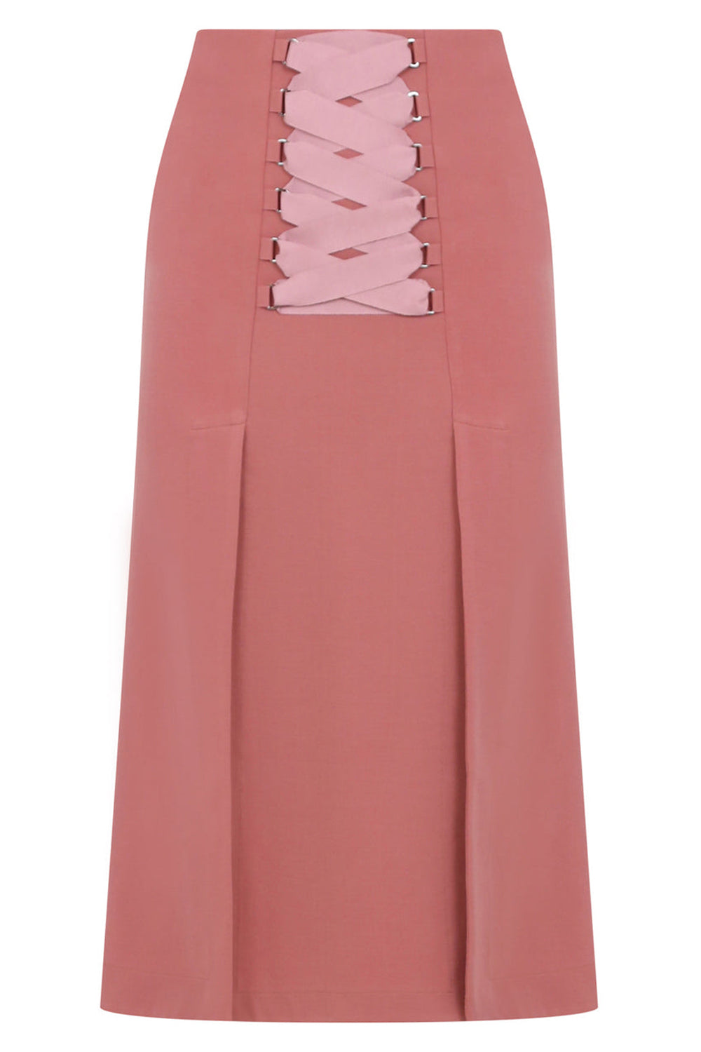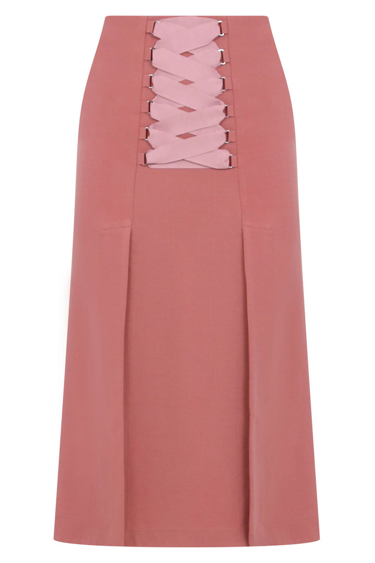 The Maison Poi Tousjour A-Line Split Skirt in Salmon is a mid-length skirt crafted from a stretch fabrication. This style features a corset-style tie detail at the front, two front splits and a concealed side zipper.