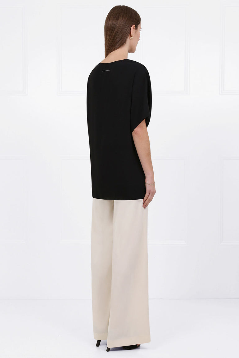 The MM6 Two Tone Blouse in black/off white is an asymmetric style featuring an elastic waist, an asymmetrical hemline and contrast front panel.