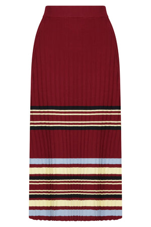 Wander Knit Top has a knitted construction with a horizontal stripe pattern and is fully pleated with an collared neck and long sleeves featuring partial button plackets and colour-block stripes at front and sleeves.