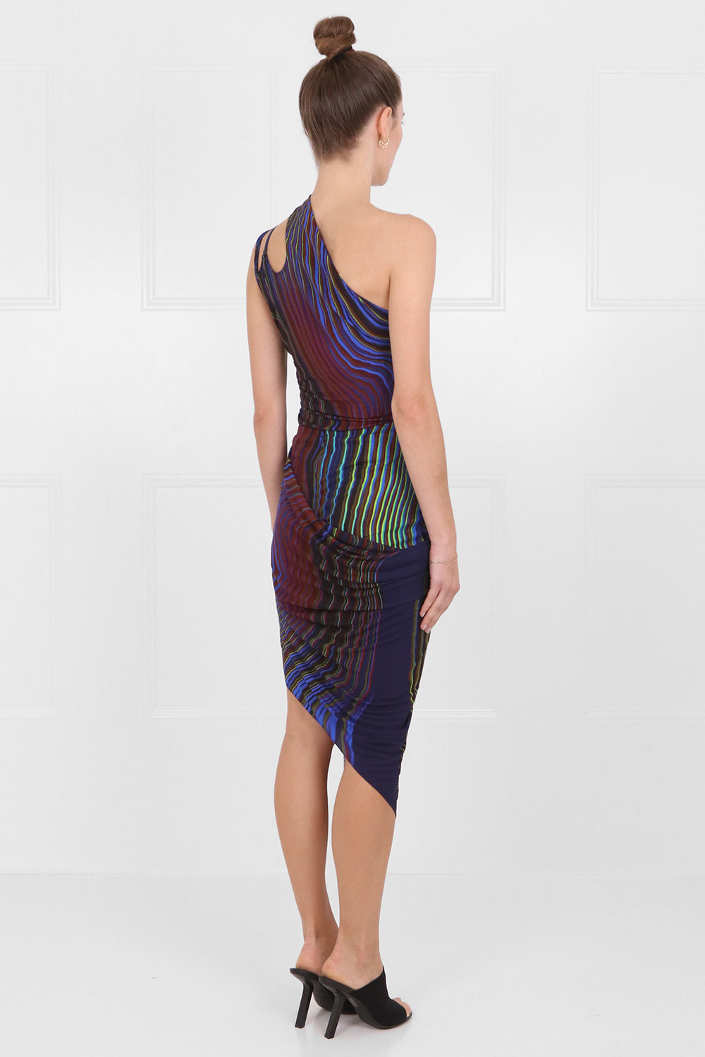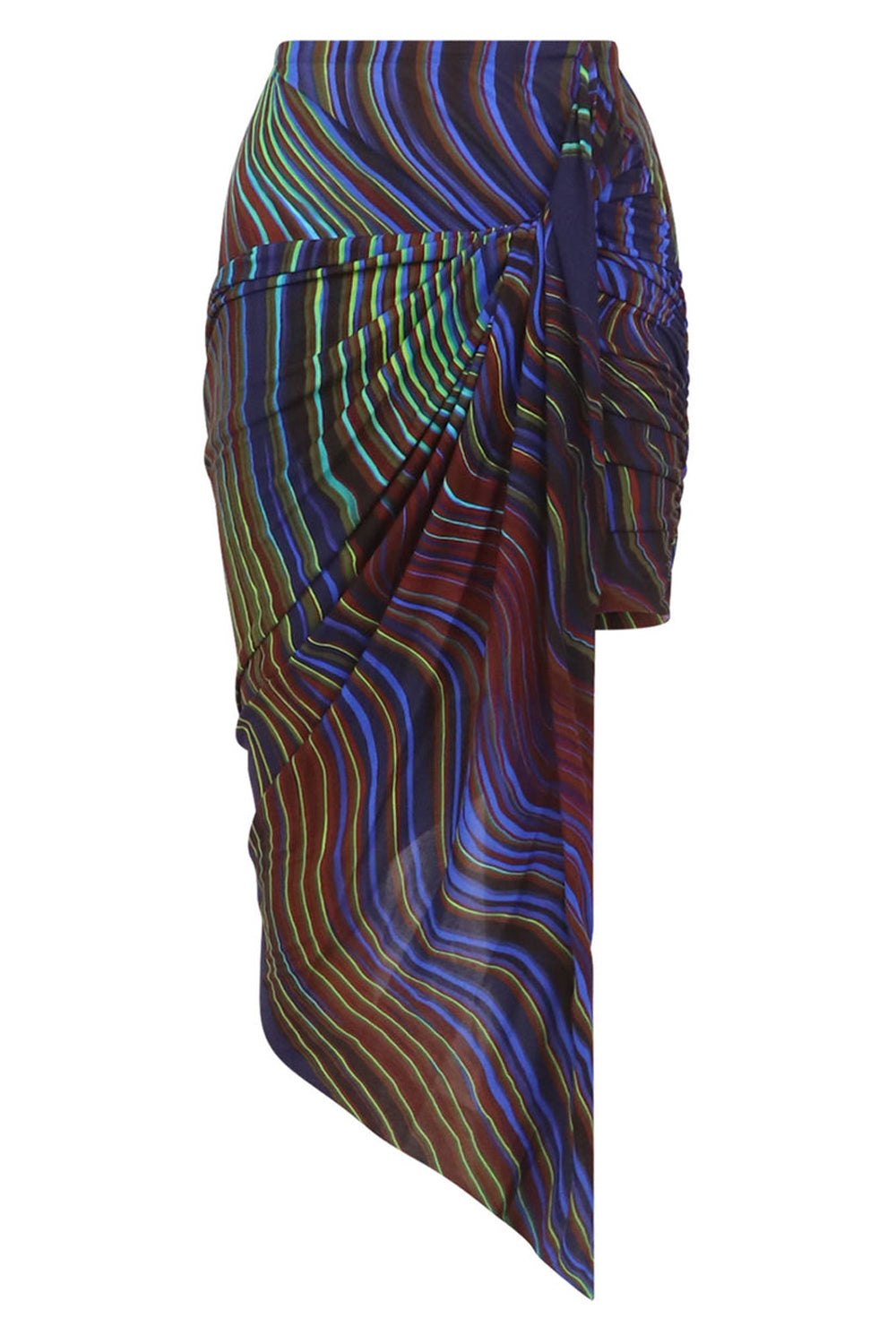 The Mugler Wave Print Asymmetric Skirt in blue/lime is crafted from a navy and lime wave print jersey fabric. This style features an asymmetric draped design with a twisting detail at the front.