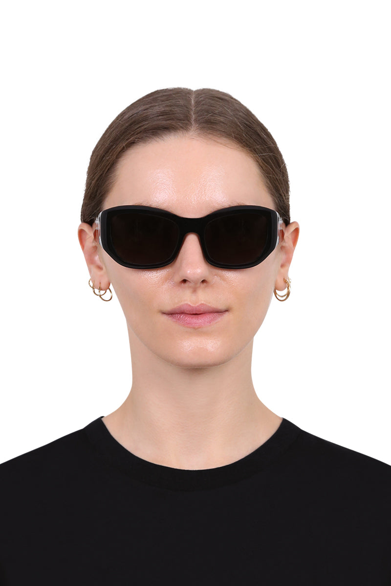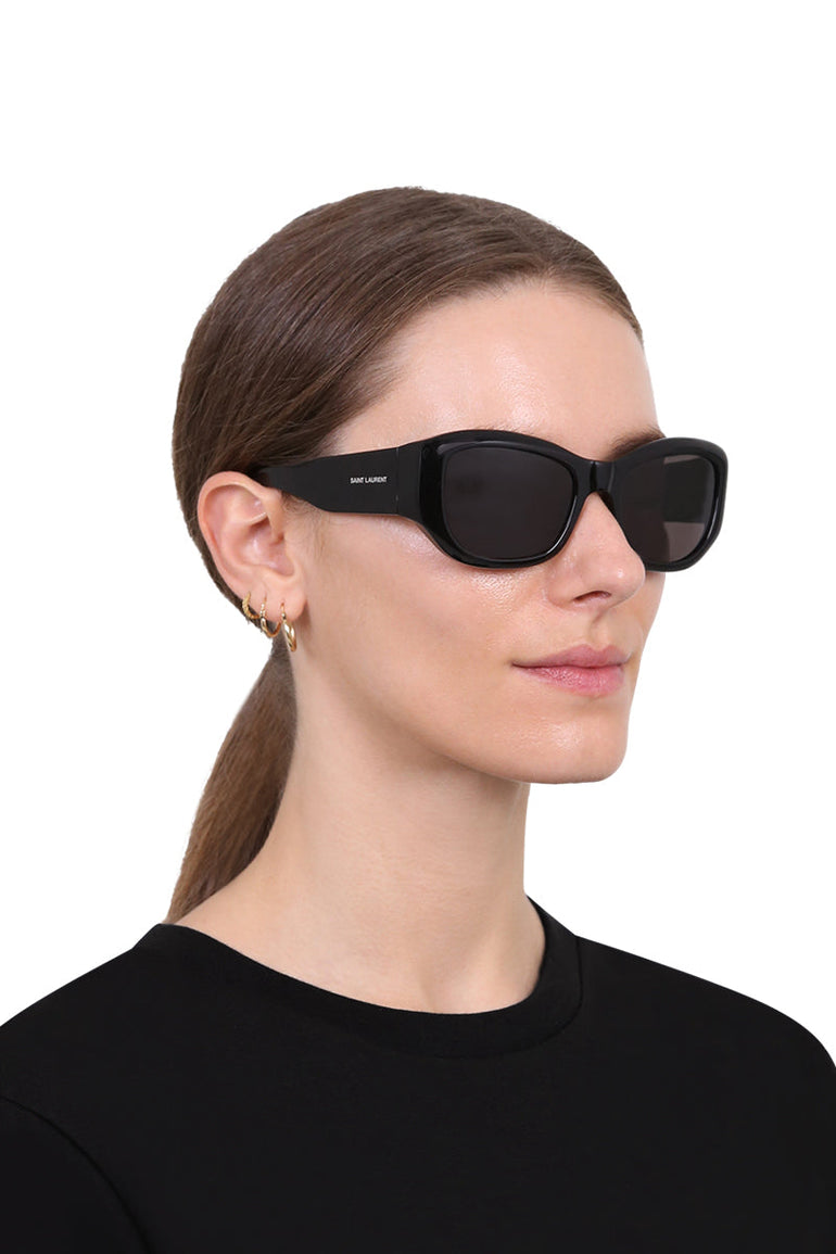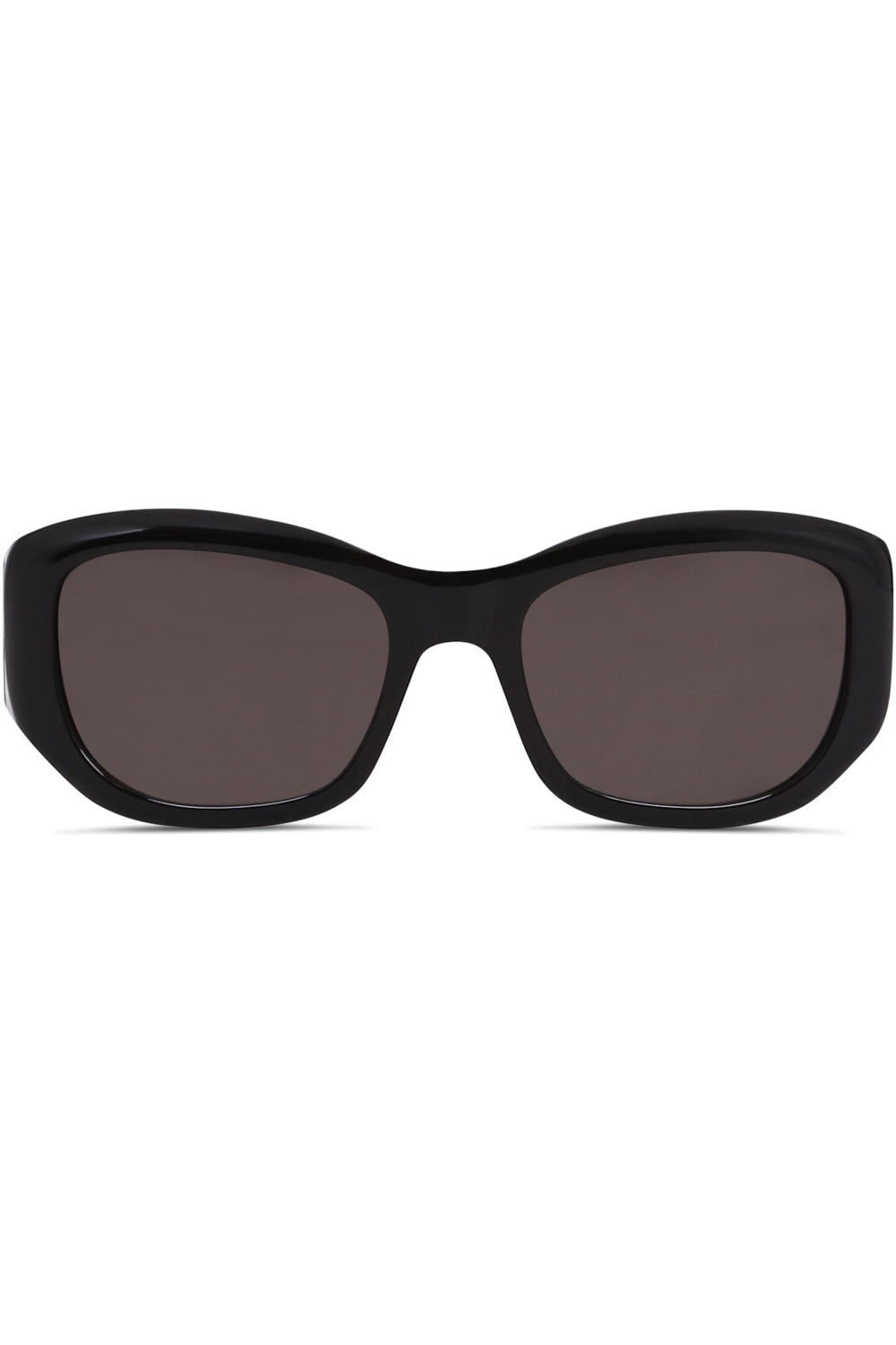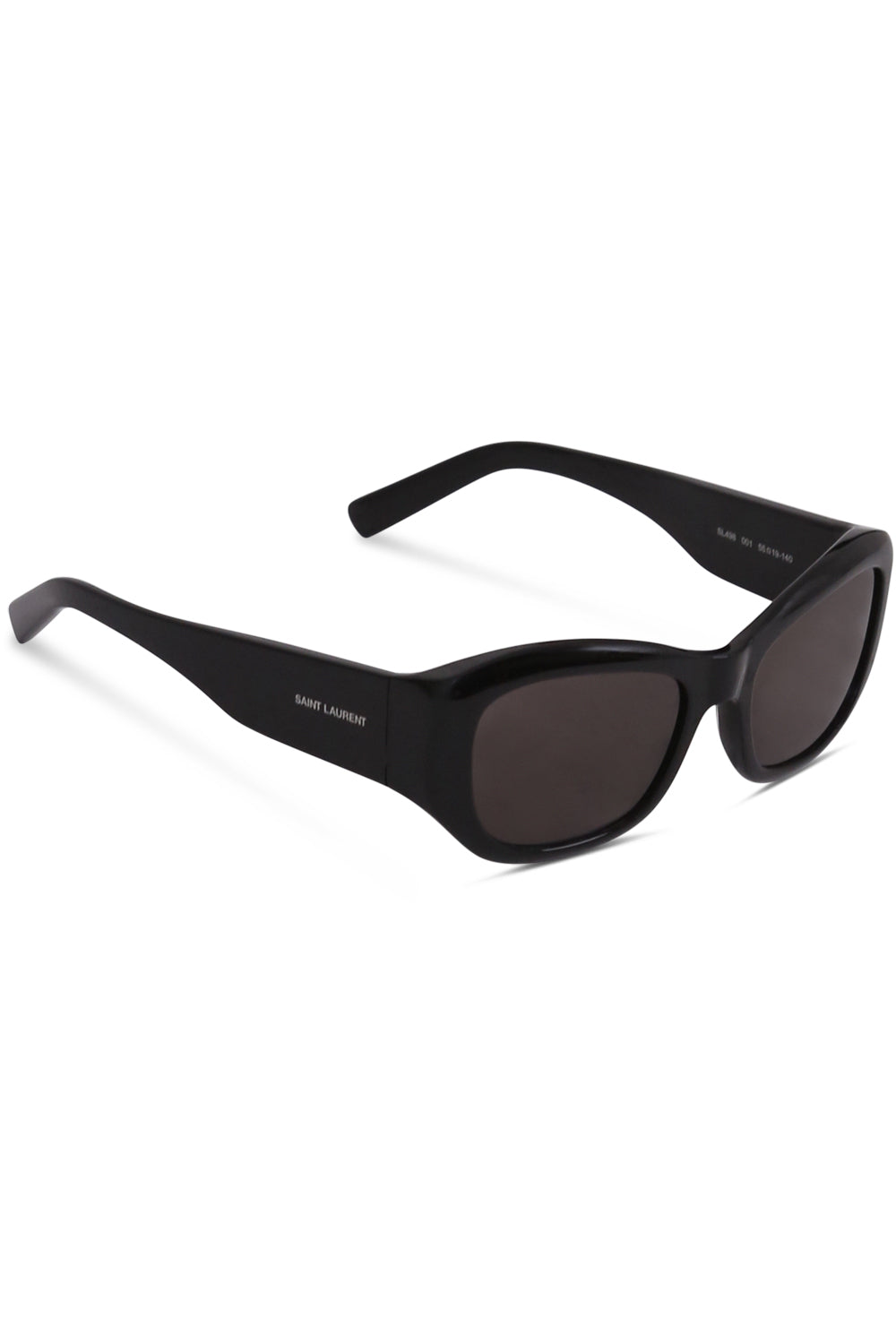 The Saint Laurent YSL SL 498 Sunglasses are crafted from acetate. This style features black, curved rectangular frames, black lenses.