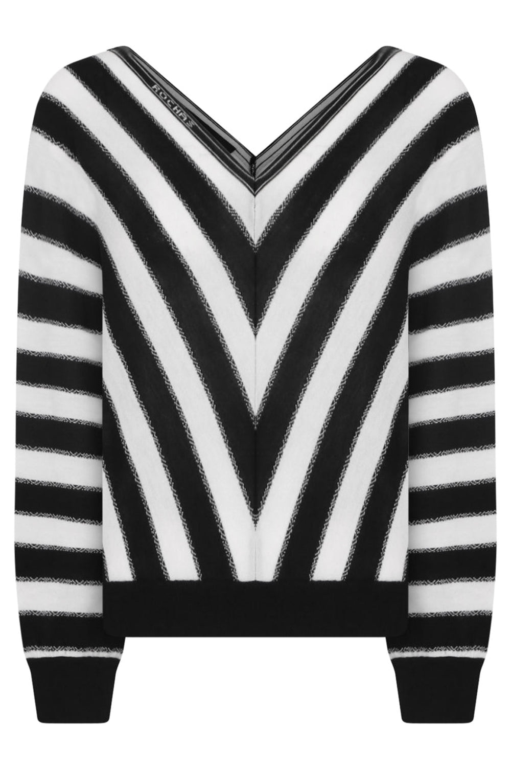 The Rochas Stripe V-Neck Knit Top is crafted from wool, featuring a V neckline with the logo stitched in at the collar, ribbed hems and long sleeves.