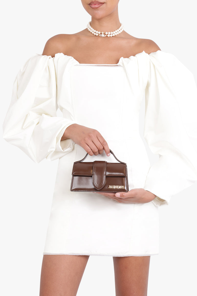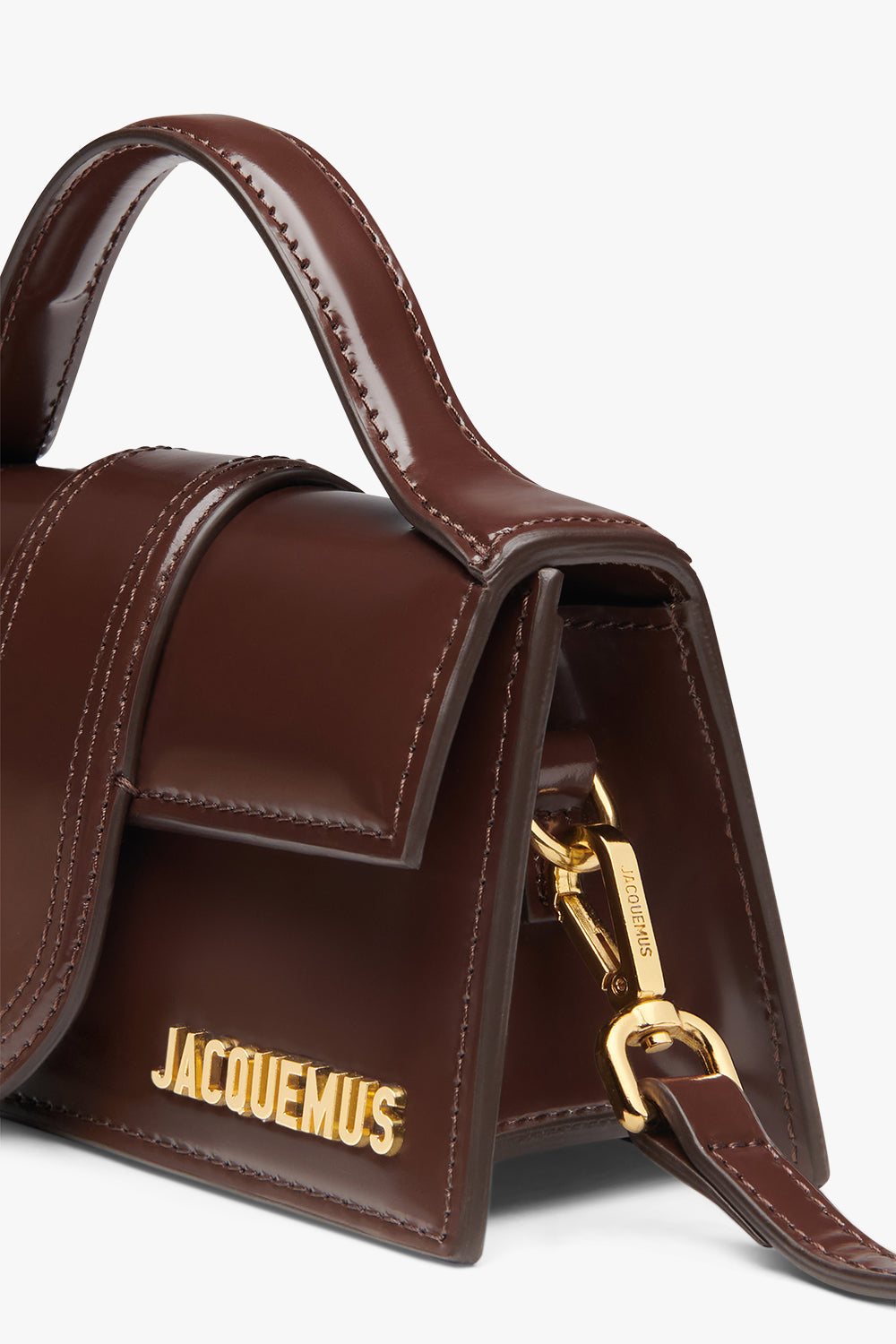 The Jacquemus Le Bambino Bag in Shiny brown is crafted from a calfskin leather and features a small top handle, a removable strap, a rear pocket, flap magnet closure and a gold-tone logo plaque.