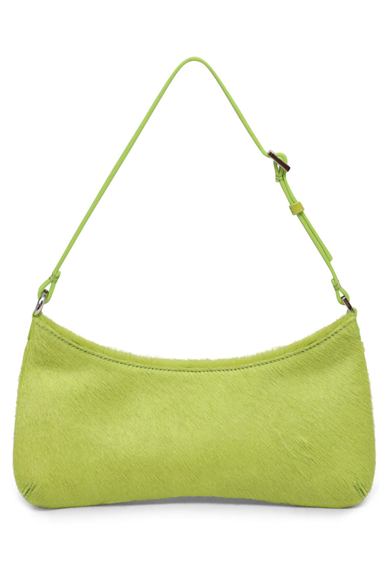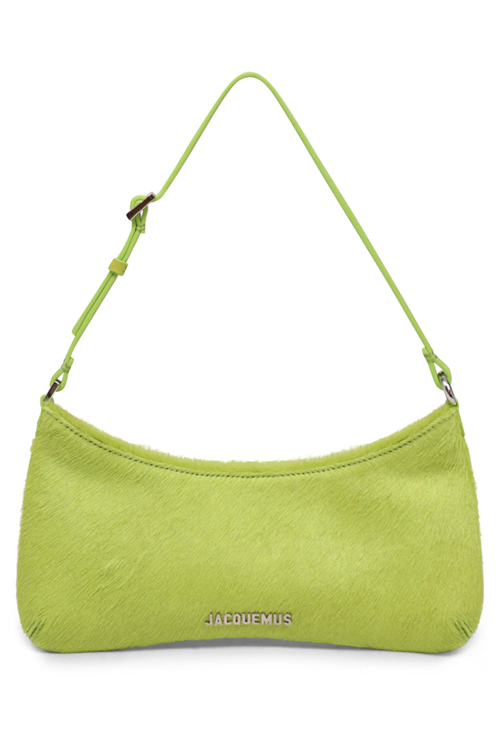 The Jacquemus Le Bisou Bag in Neon Green was introduced during the house's Le Raphia runway collection and features a baguette shape with thin adjustable buckled strap and zip closure with one internal patch pocket. It is crafted from cowhide with silver metal hardware and logo.