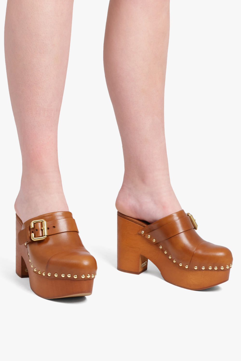 The Chloe Jeanette Clog Mule is crafted in a semi shiny leather with a wood effect finish clog heel. The style features a full close rounded clog with a gold buckle detail and gold studded detail. The heel height is 110mm, with a front platform. Fabrication: Main: 100% Calfskin Leather