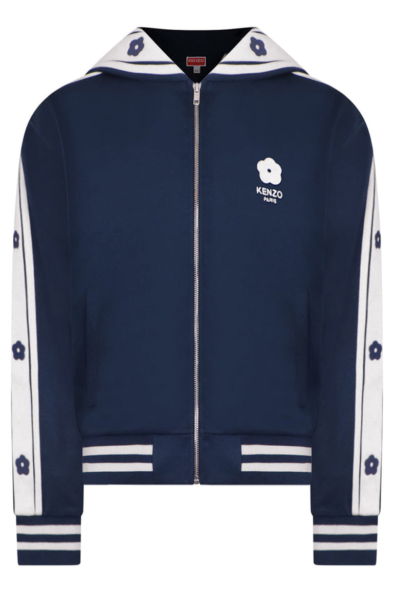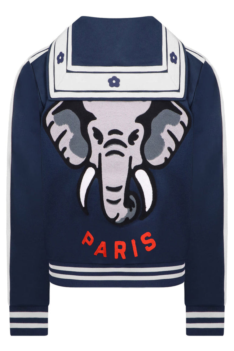 Kenzo's Elephant Jacket in midnight blue communicates nostalgic ties to sailor uniform as well as sport. It features striping on the hems, spaced out Kenzo flowers along the arms, an elephant image on the back, and overhanging flap.