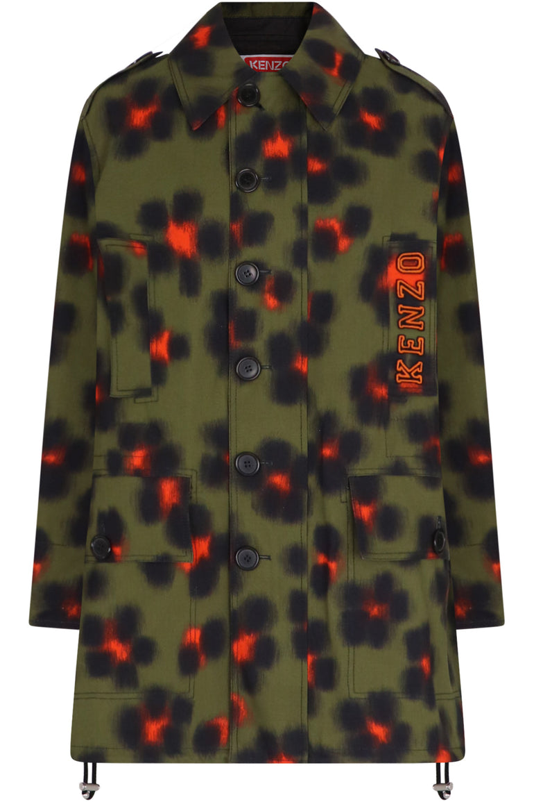 Kenzo's Printed Parka in Khaki feature a patterned or Kenzo flowers, hidden zip under button closures, tailored collar and hem drawstrings.