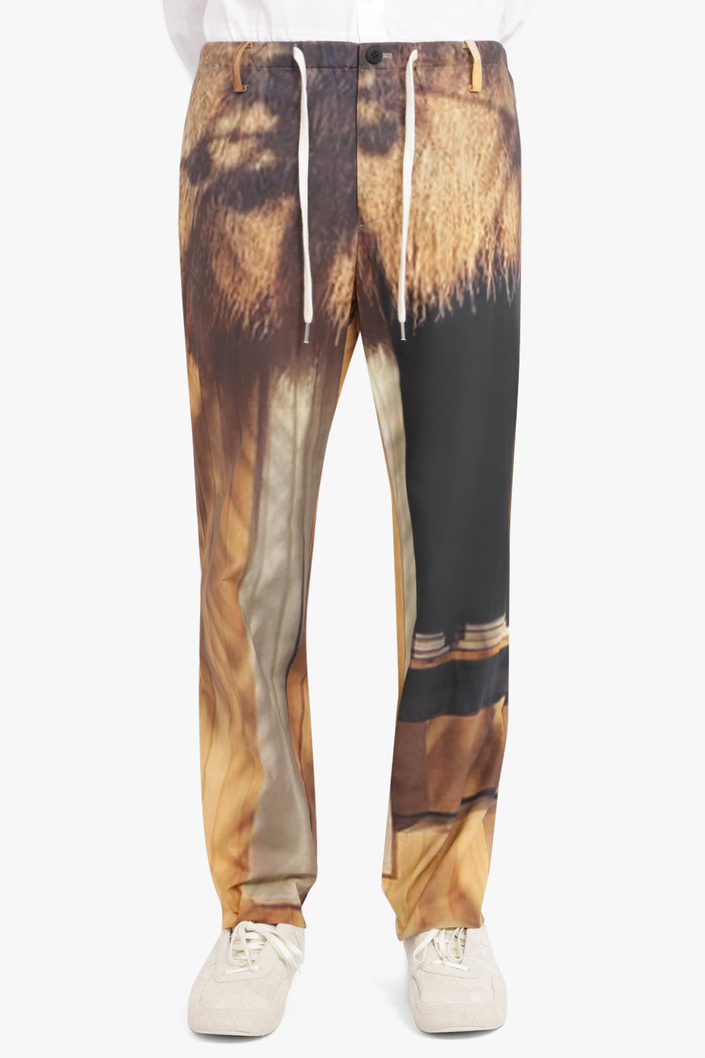 These cabin beige pants feature a straight leg cut and a drawstring waistband for ultimate comfort. The all-over print adds a touch of realistic style.