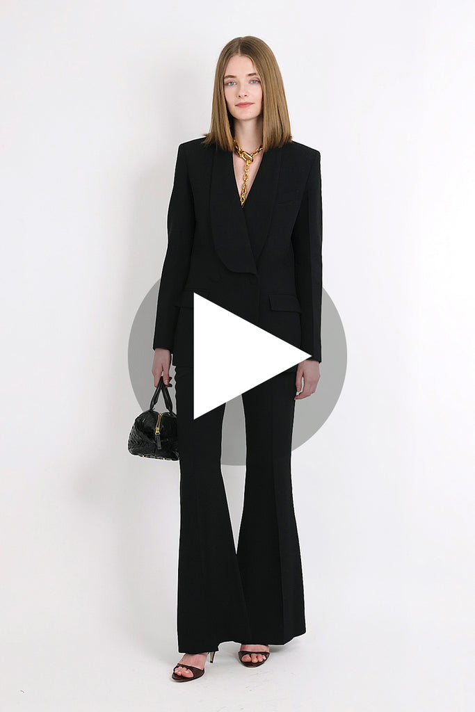 This black Cady blazer features wide peak lapels, long sleeves with shoulder pads, double-breasted button fastening, and two side flap pockets. The shawl collar adds an elegant touch and the straight hem provides a classic look.