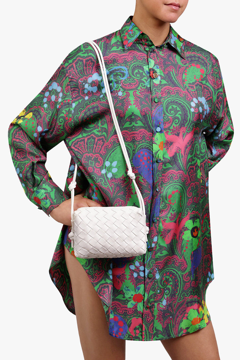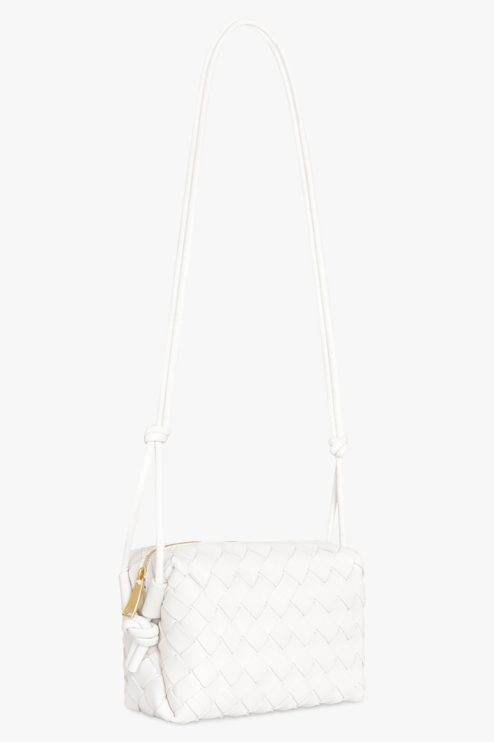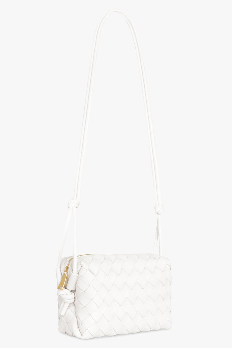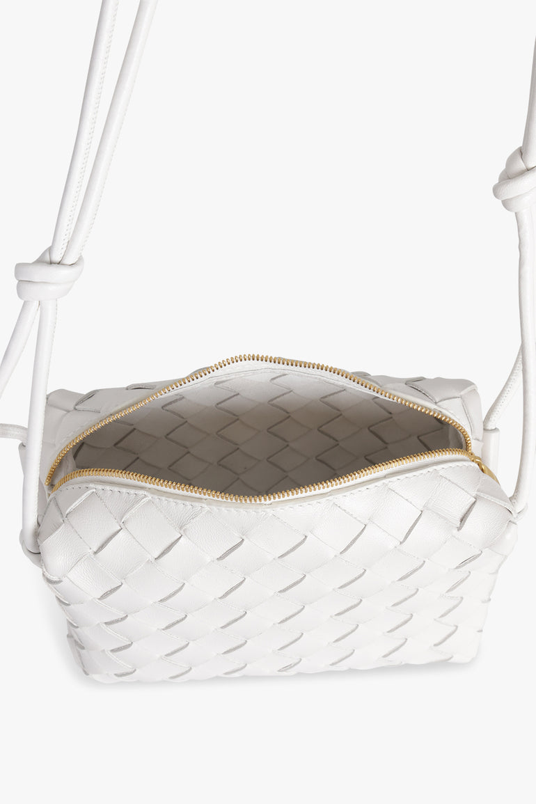 The Bottega Veneta Mini Loop Bag in White is crafted from an intrecciato leather featuring a shoulder strap, a single interior open pocket, zip closure and gold hardware