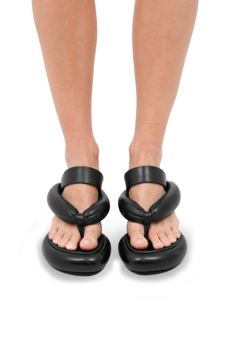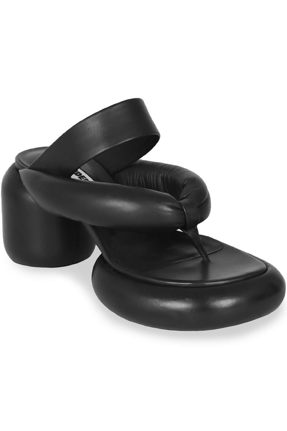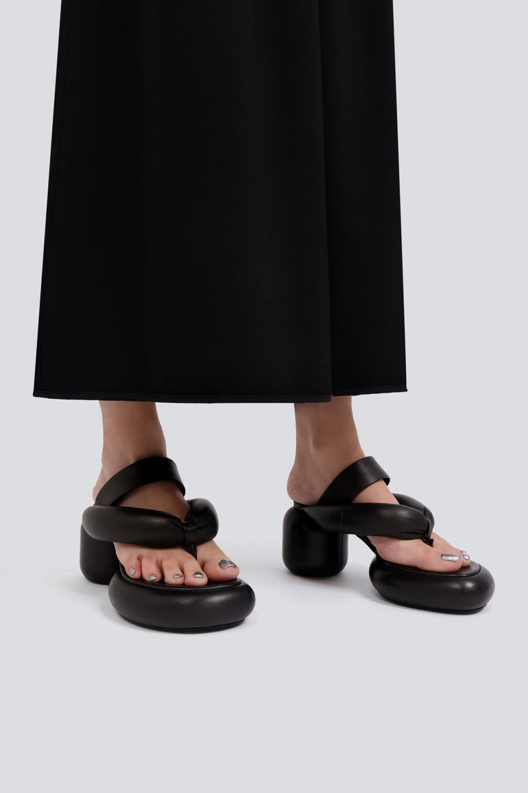 The Jil Sander Thong Mule in Black is crafted from a leather fabrication and features a block heel, a branded insole, a padded leather toe strap and an across foot strap.