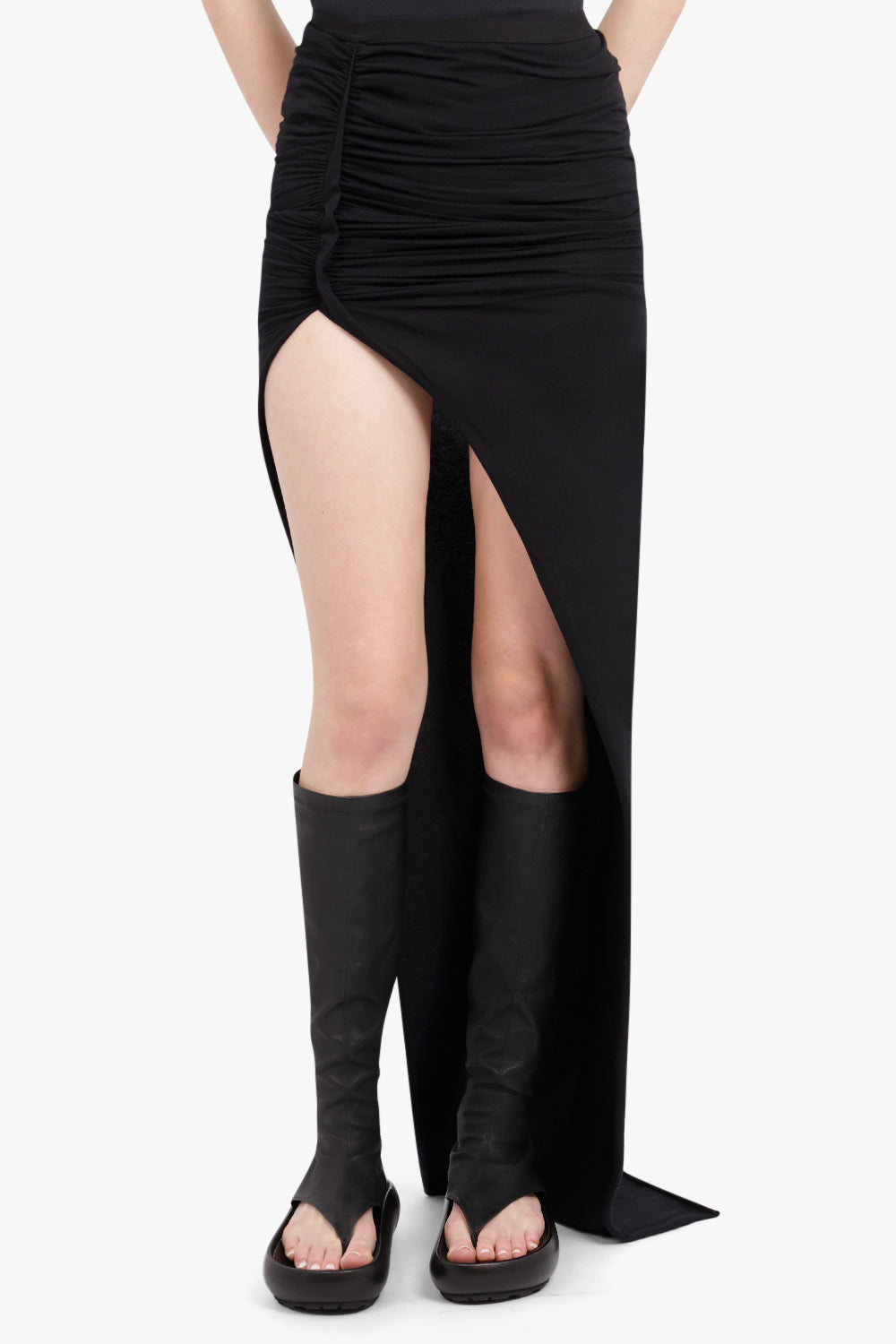 This classic cotton jersey skirt features an asymmetrical design and is accented with topstitching and gathering at the front. The front hem also includes a vent for added style.