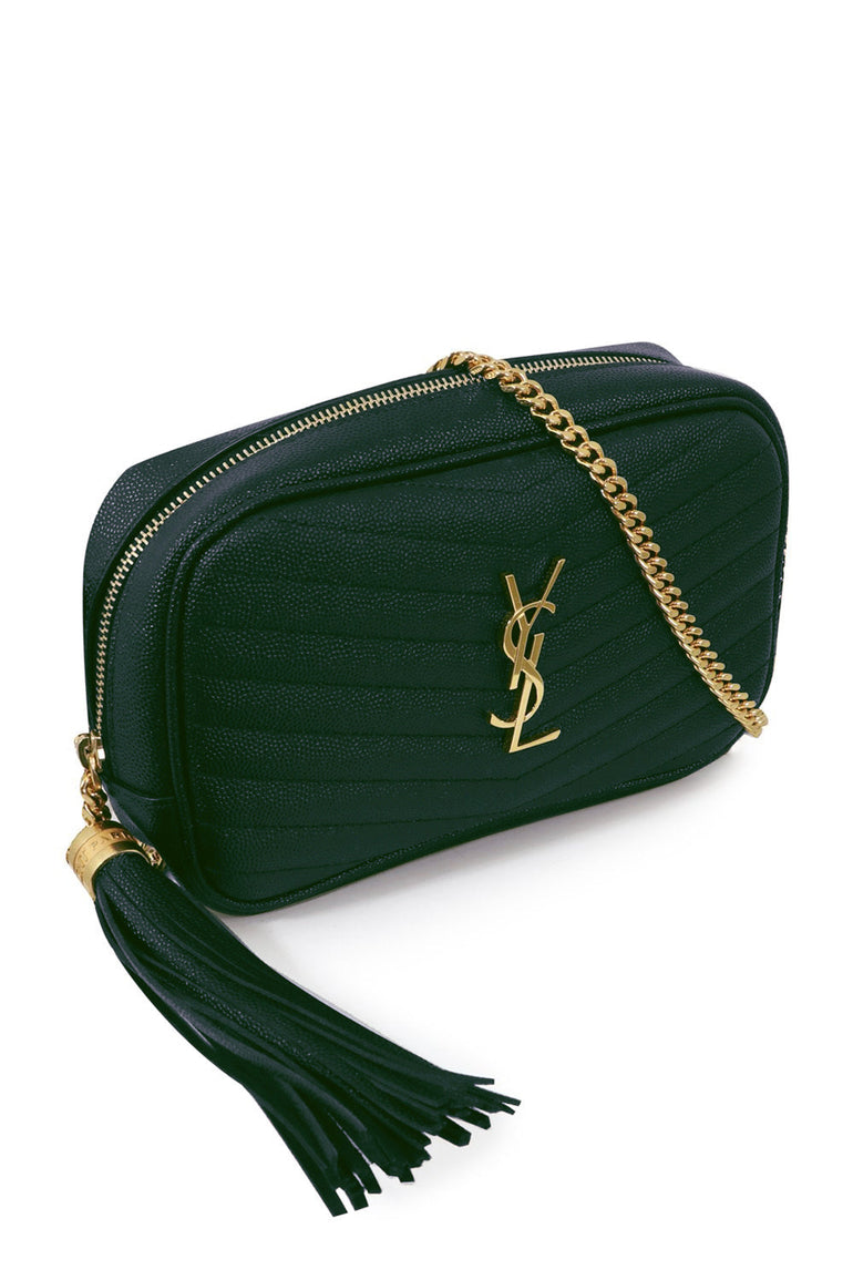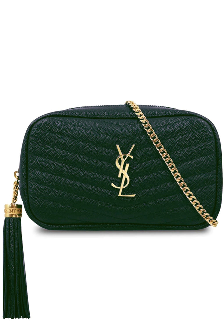 The Saint Laurent Lou Mini Camera Bag is a monogram shoulder bag featuring a gold chain strap, leather tassel zipper, interlaced YSL initials in metal at the centre and quilted overstitching.