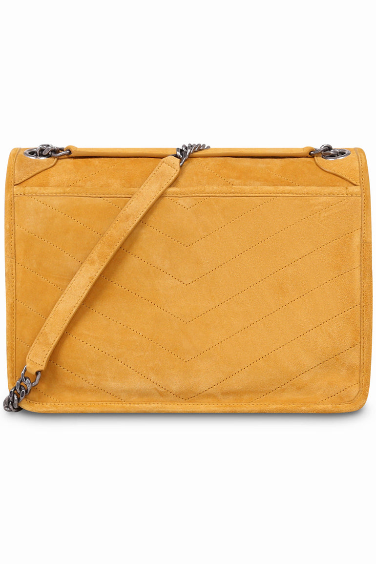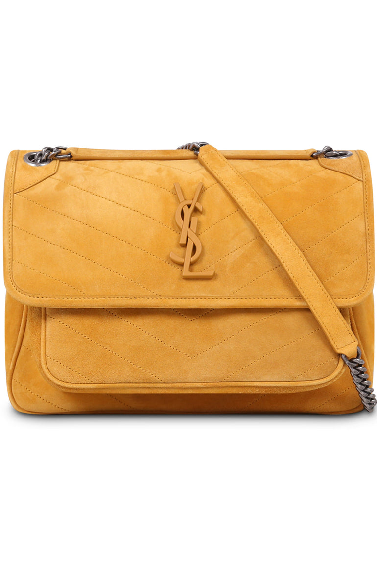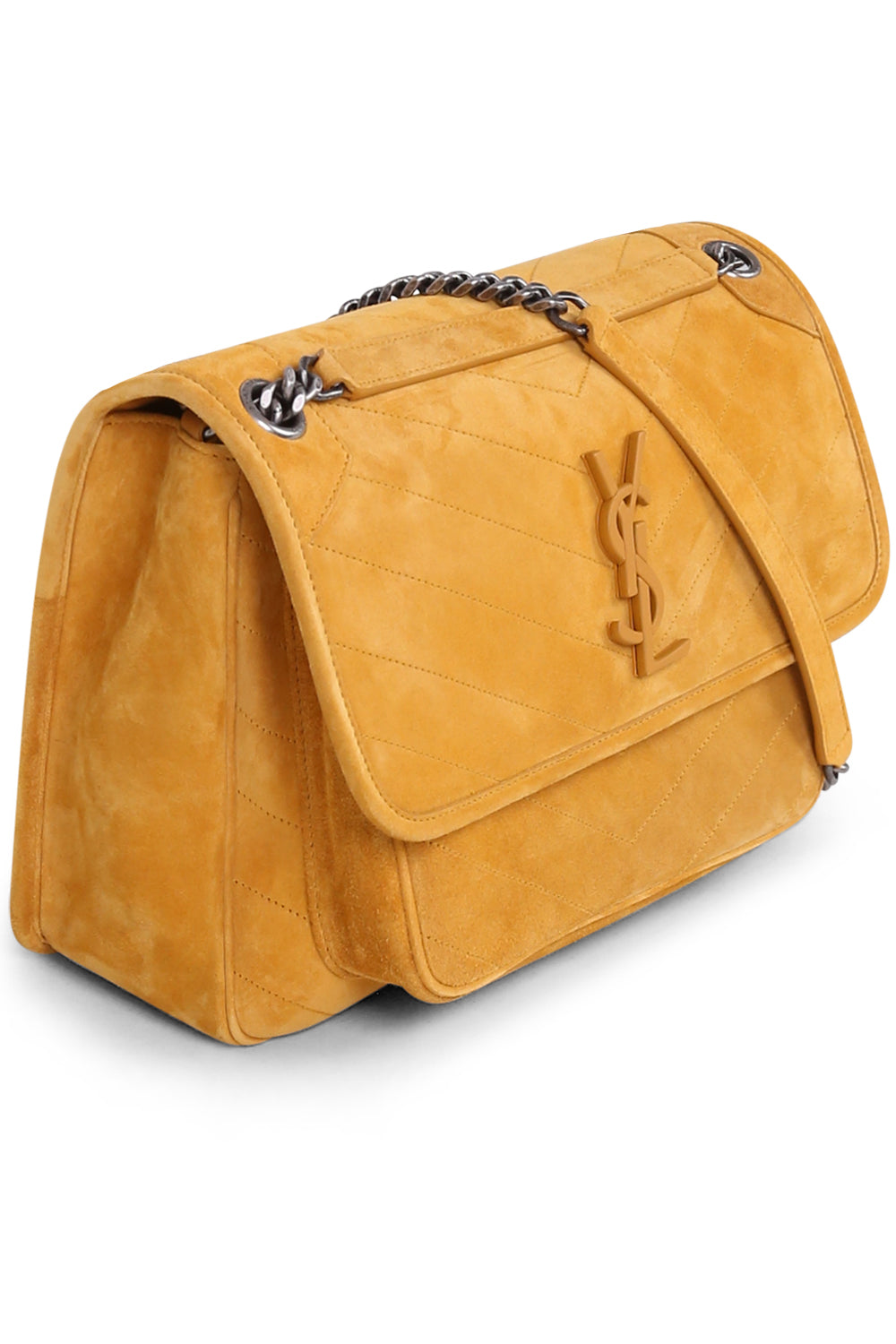 The Saint Laurent Niki Medium Bag is crafted from a suede fabrication featuring a tonal YSL logo plaque. This style features a fold over top with magnetic closure and a chain and leather strap that can be worn doubled on the shoulder