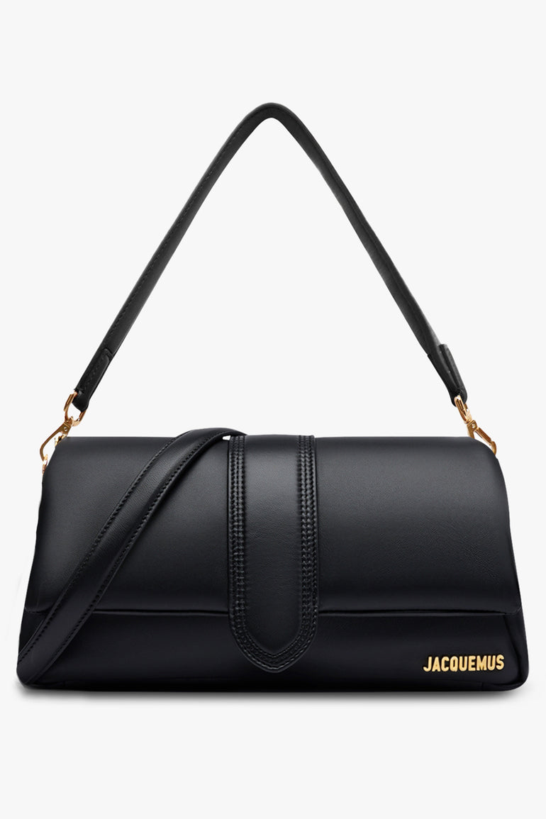 The Jacquemus Le Bambimou Bag in Black is a puffed flap bag, crafted from soft padded leather and gold metal hardware. Debuting in the Le Raphia collection, this bag is the latest iteration of the Le Bambino family and features a magnetic flap tab closure, interior pocket and double shoulder straps to carry on the shoulder or across the chest.