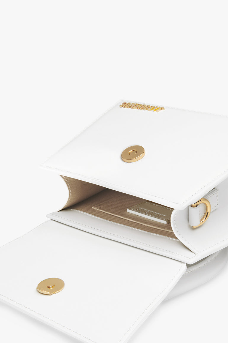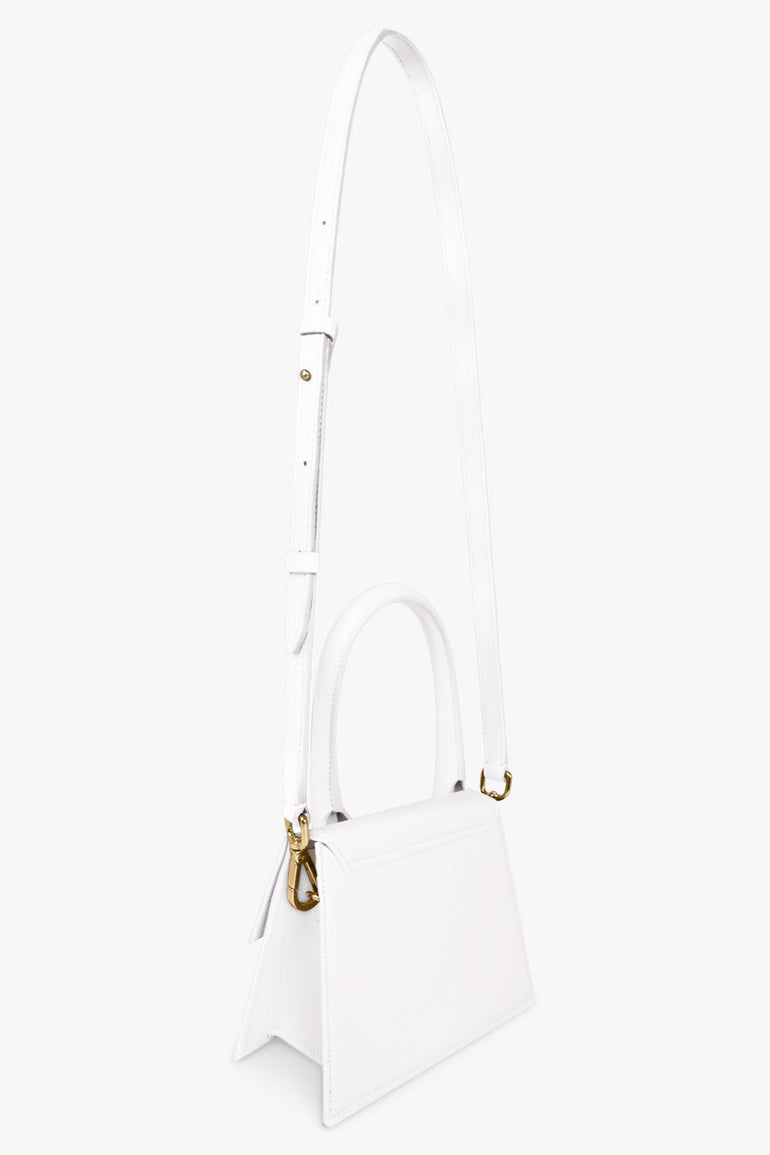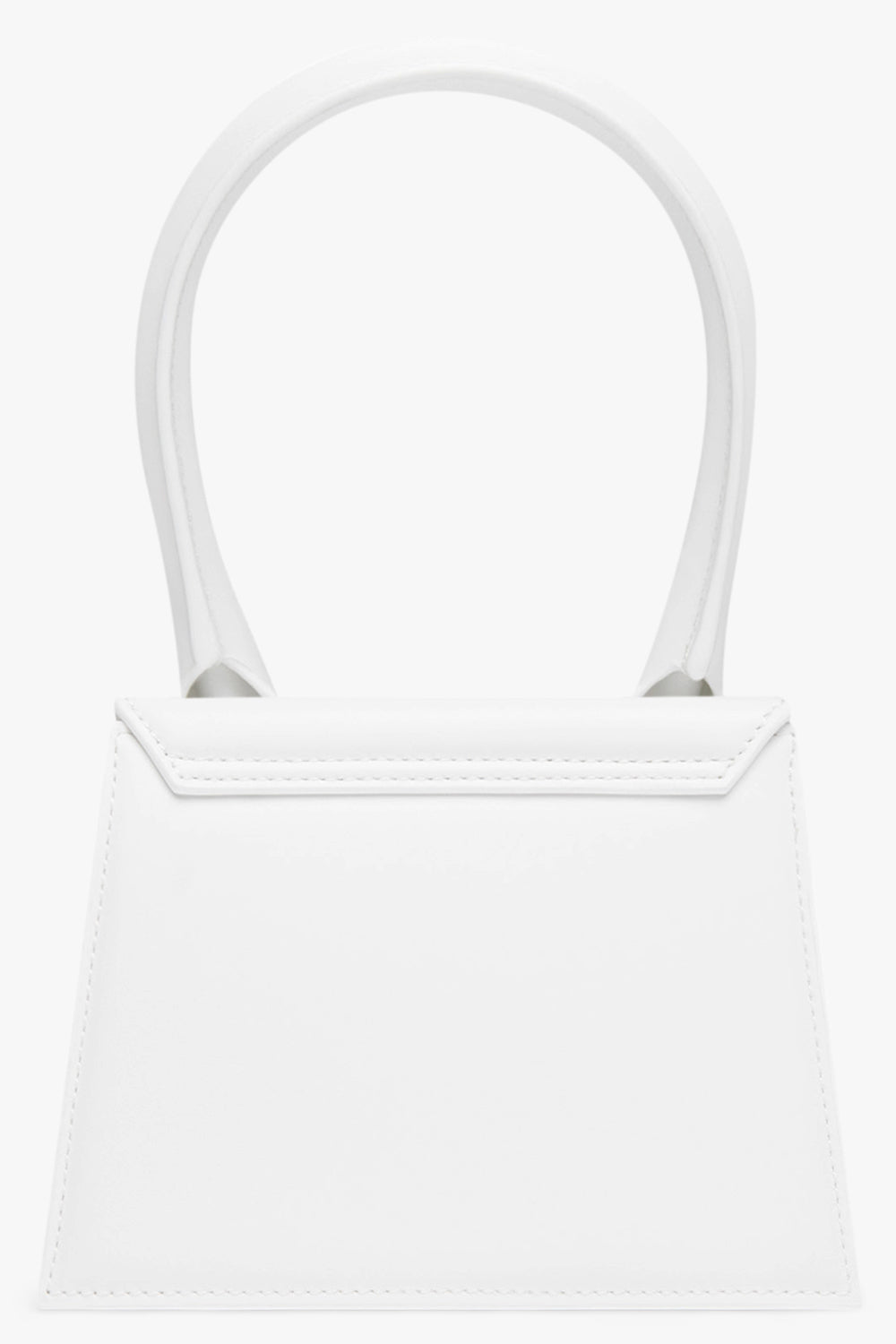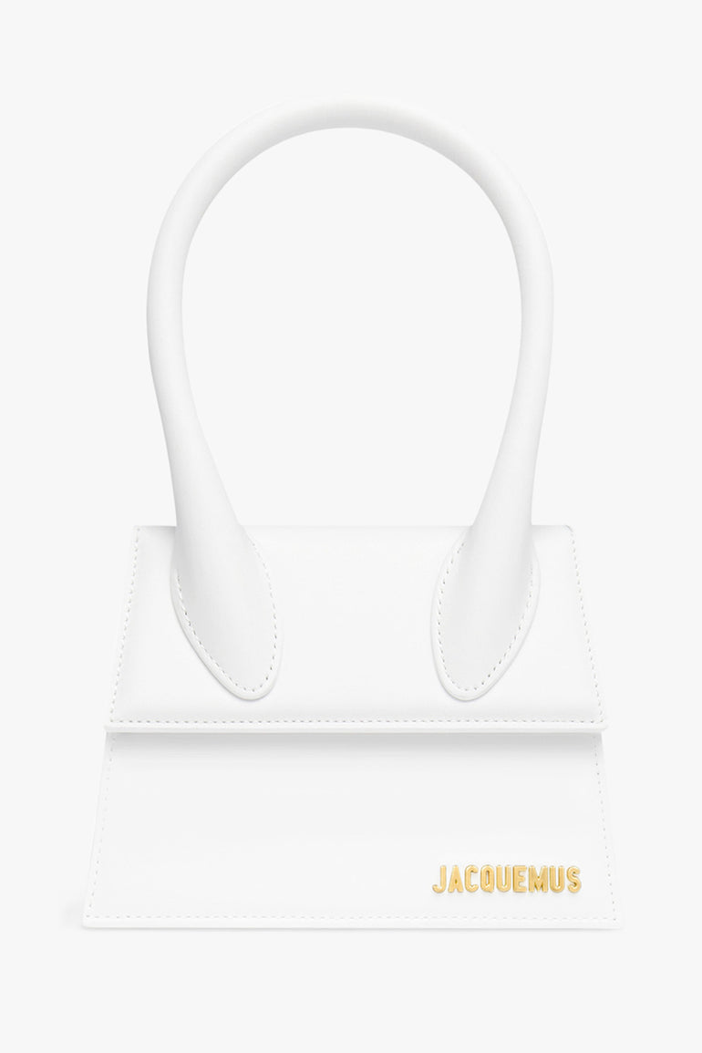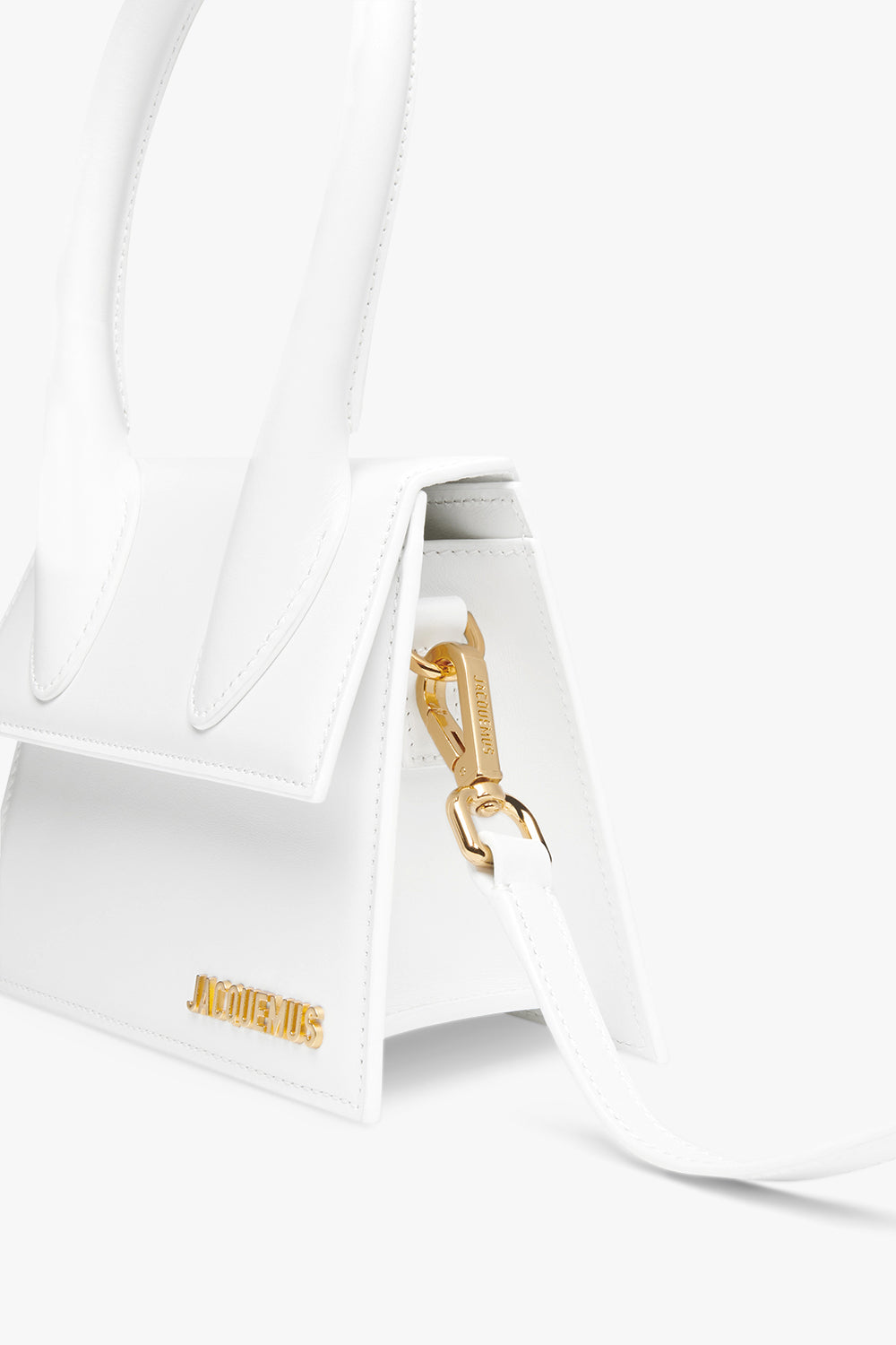 Jacquemus le Chiquito Moyen Bag在白色配有圆顶手柄,可拆卸 和可调肩带,折叠顶部,磁性封盖和主要内部隔室和金色标志斑块。