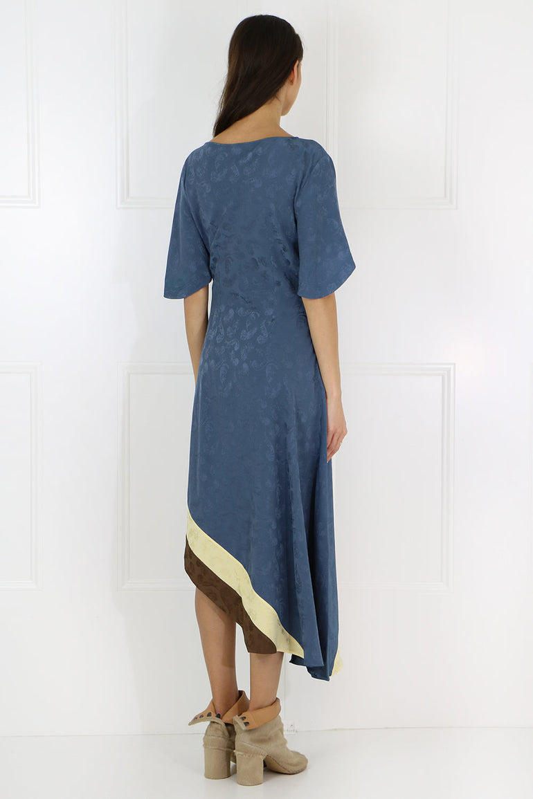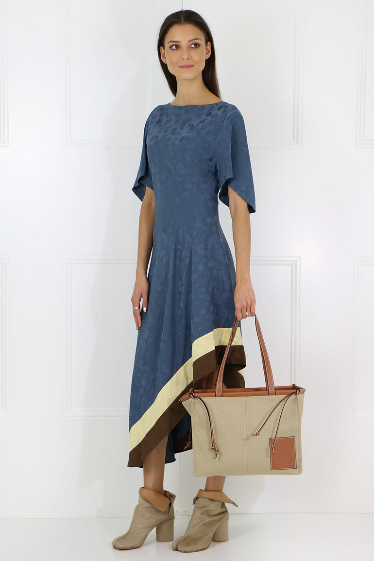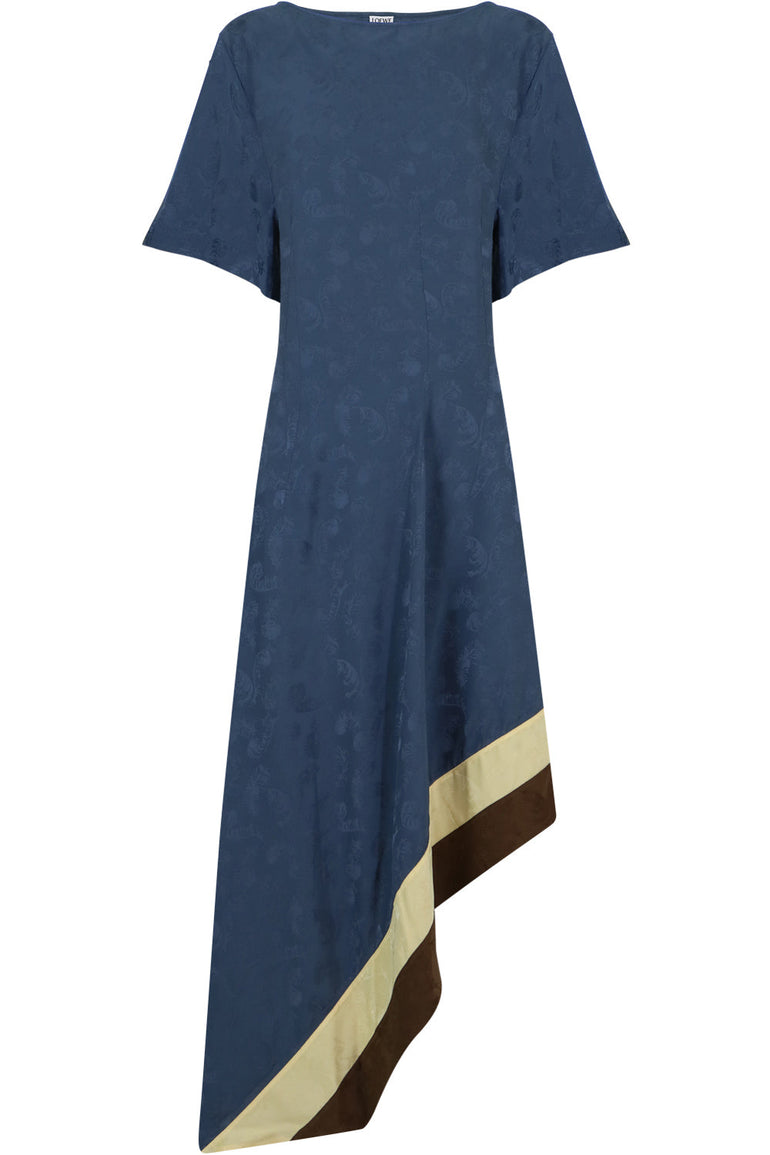 Loewe不对称连衣裙是一款短袖风格,具有总装饰印刷品和不对称的HEMLINE。