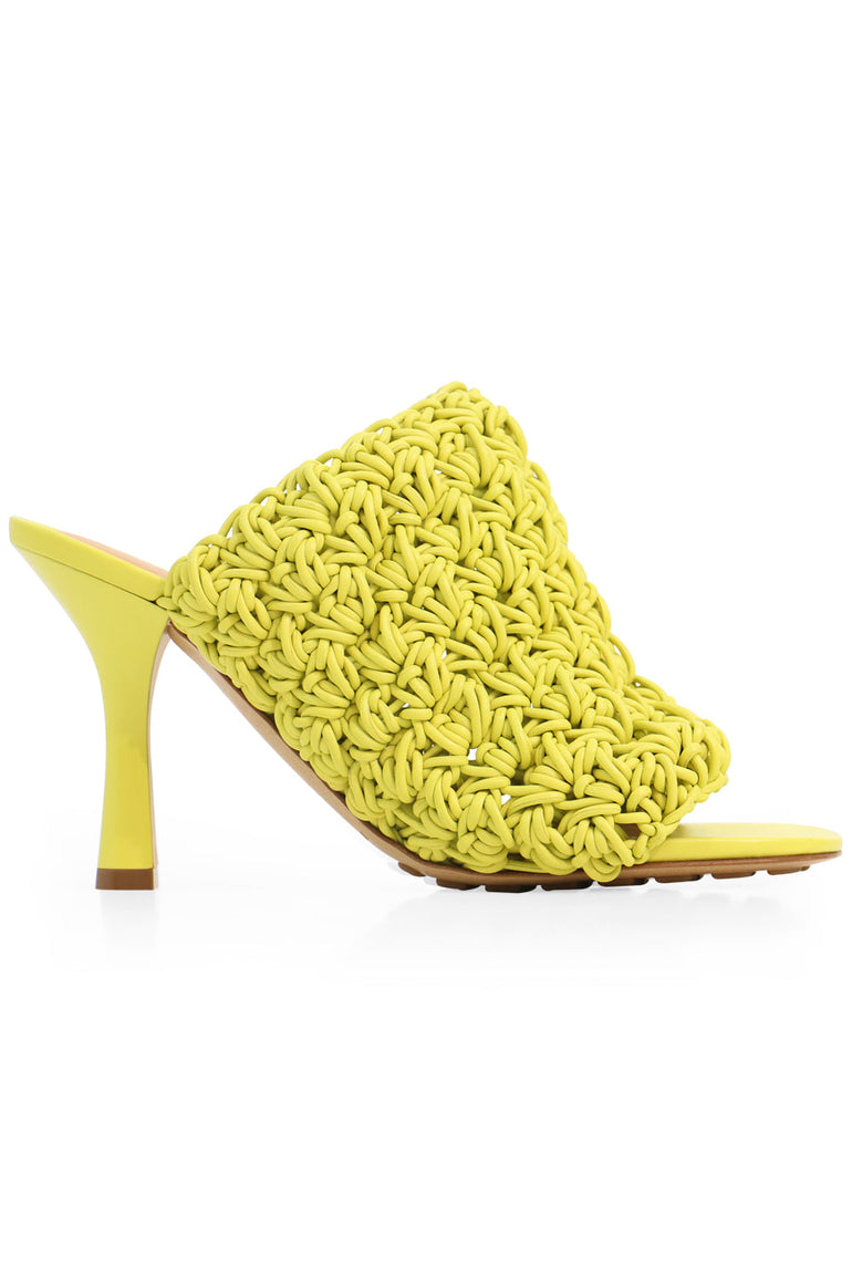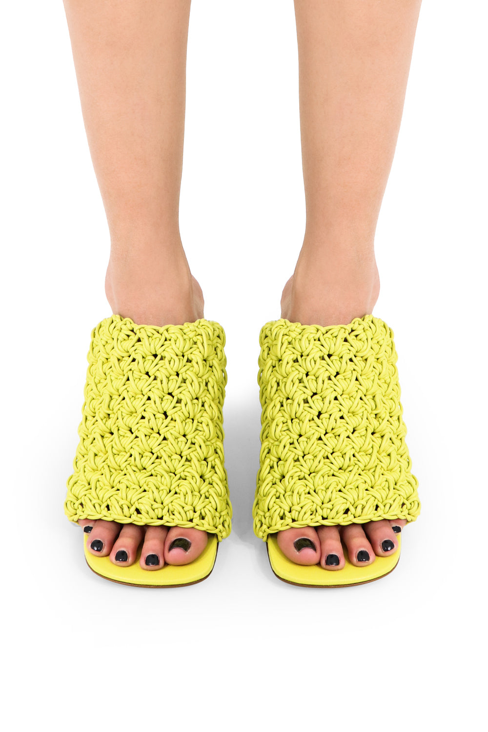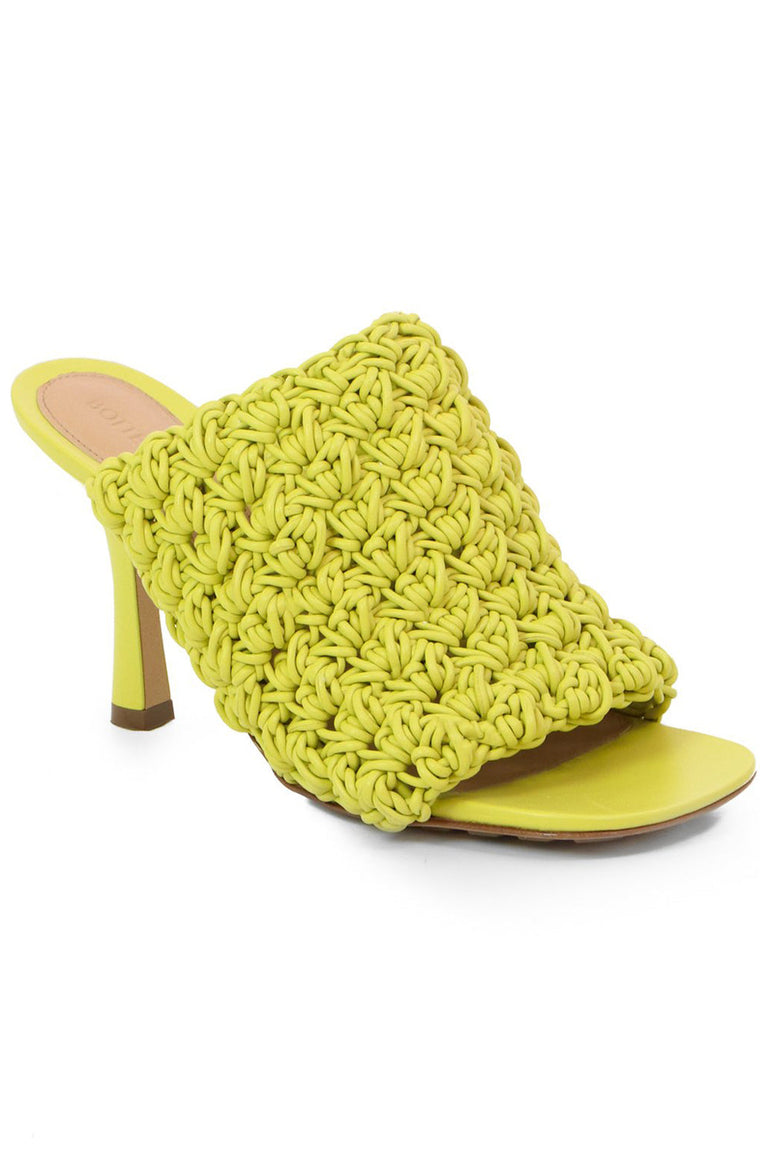 Bottega Veneta板骡子在梨中,带着广场脚趾和一个引人注目的钩针启发皮革编织宽带。