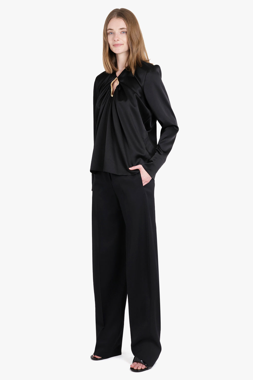 Featuring a Brass center accentuating the ruched chest, this Long Sleeve Draped Blouse has long sleeves and buttoned cuffs.