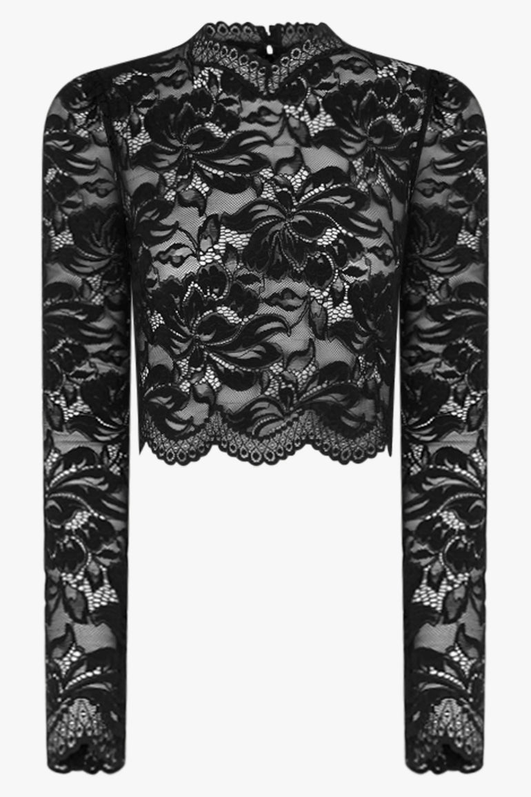 The Rabanne Haut Long Sleeve Top is crafted from a black lace and is a fitted, cropped, semi-sheer style featuring a high neckline, long sleeves and a zip closure at the back.