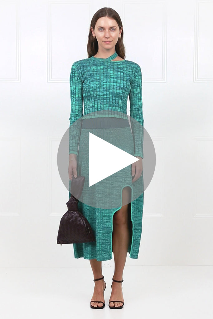 The Hiram Pleated Knit Skirt is crafted from a stretch knit fabrication and features a contrast ribbed waistband with the PH5 logo at the back center, and a midi length with an asymmetric front split.