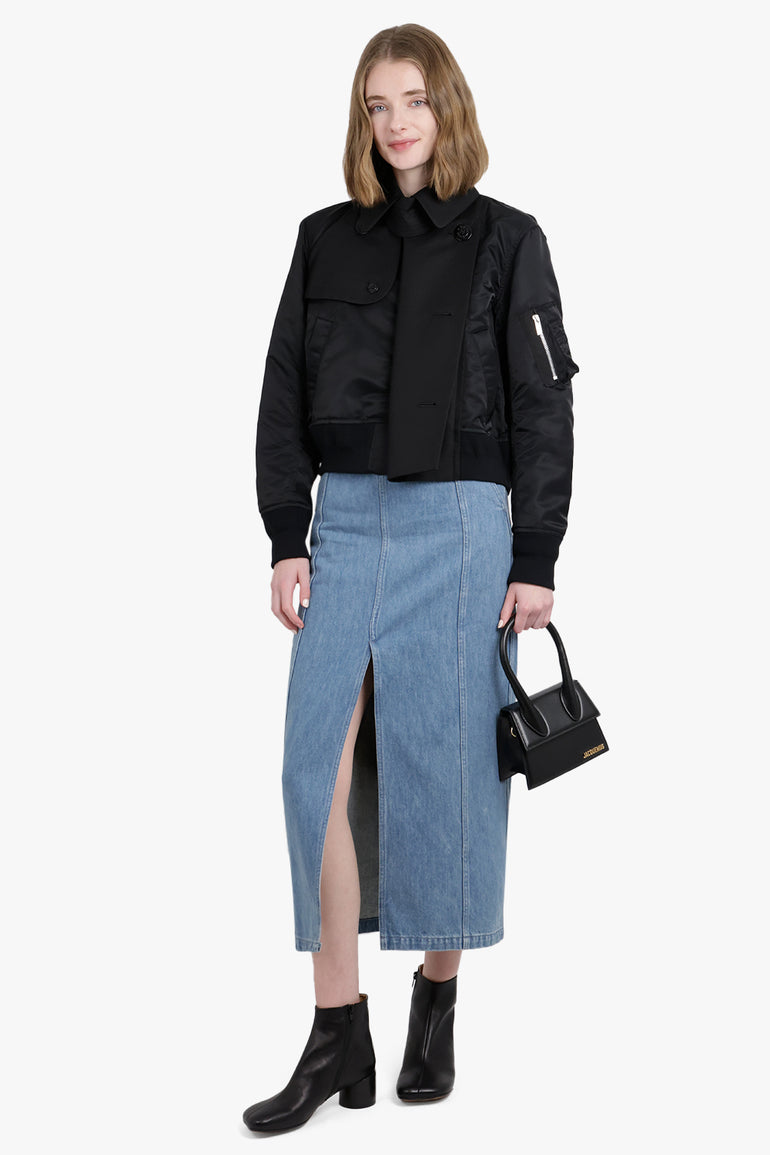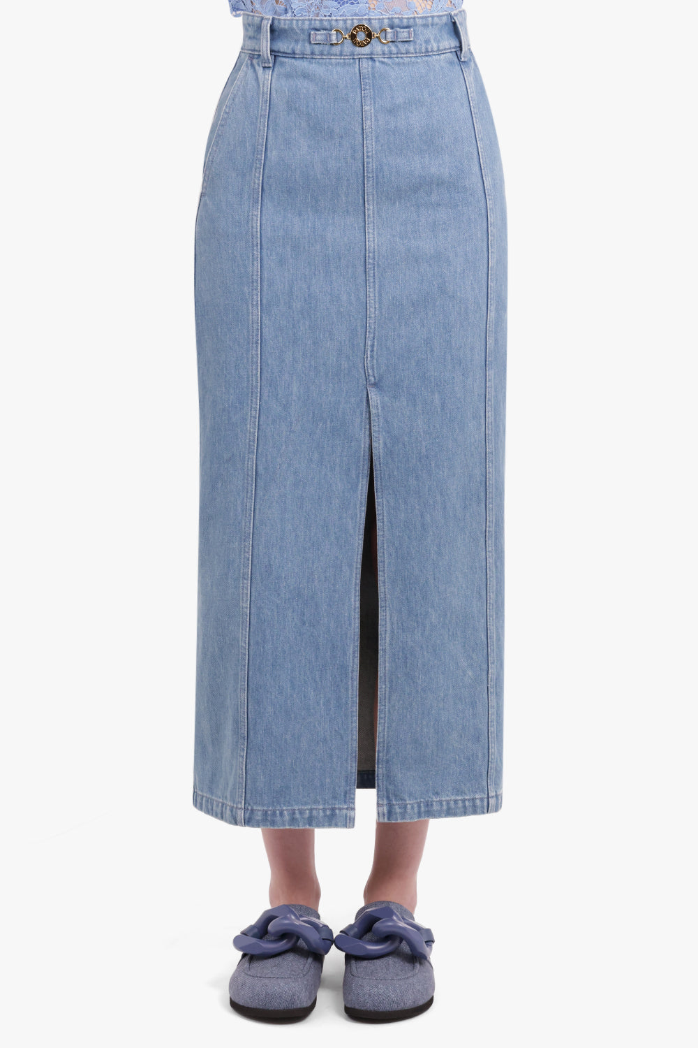 Ice Blue organic cotton denim skirt. Sustainable laser fading. High waist. Midi length. Fitted silhouette with darts at the back. Gold-tone Patou-engraved Medallion embellishment at the front. Belt loops. High slit at the front. Pockets at the sides. Zip fastening at the back. Patou embroidery at the waist.