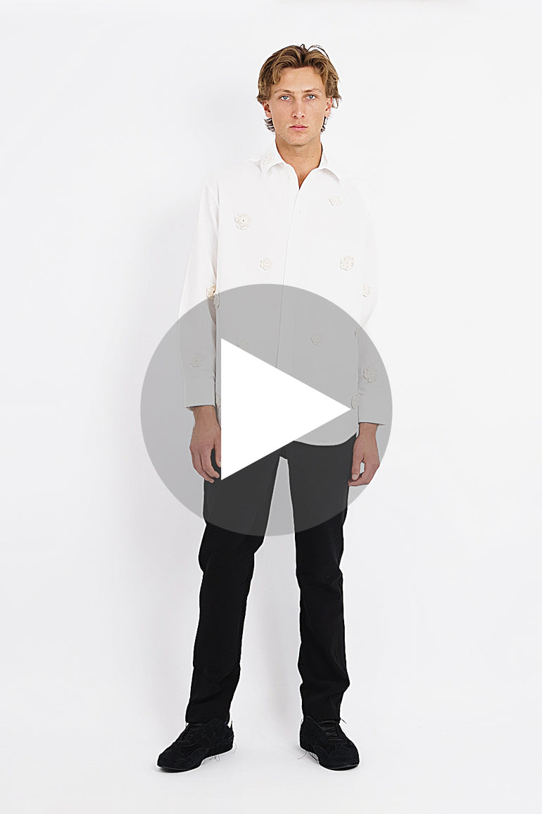 Oversized shirt jacket in a soft hemp drill. Featuring silver stud hardware, single-button barrel cuffs and artisanal hand-woven floral embellishments.