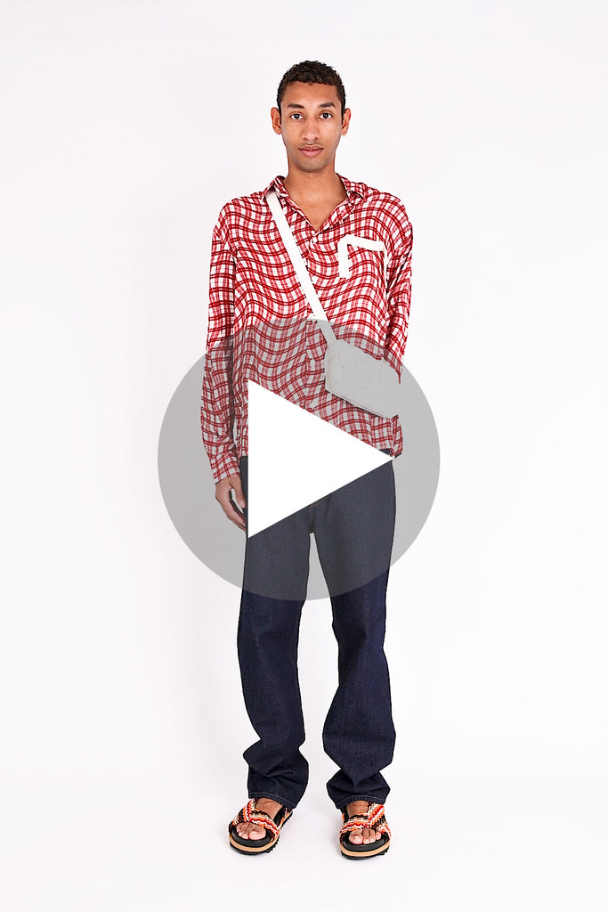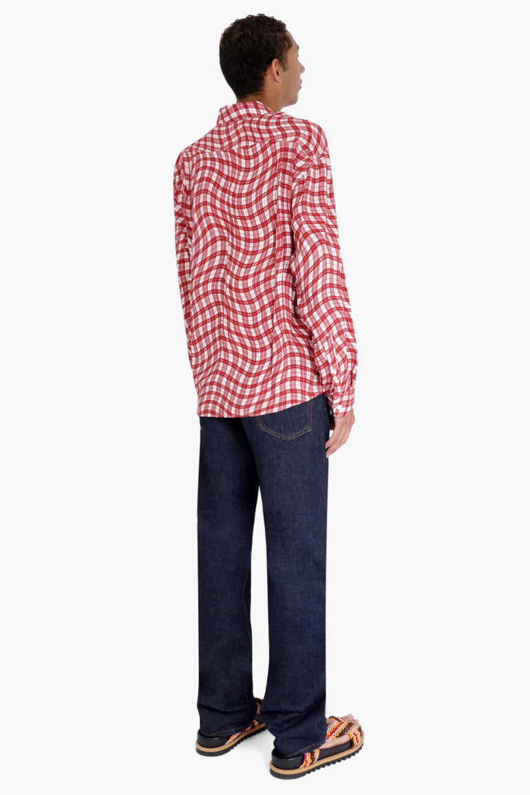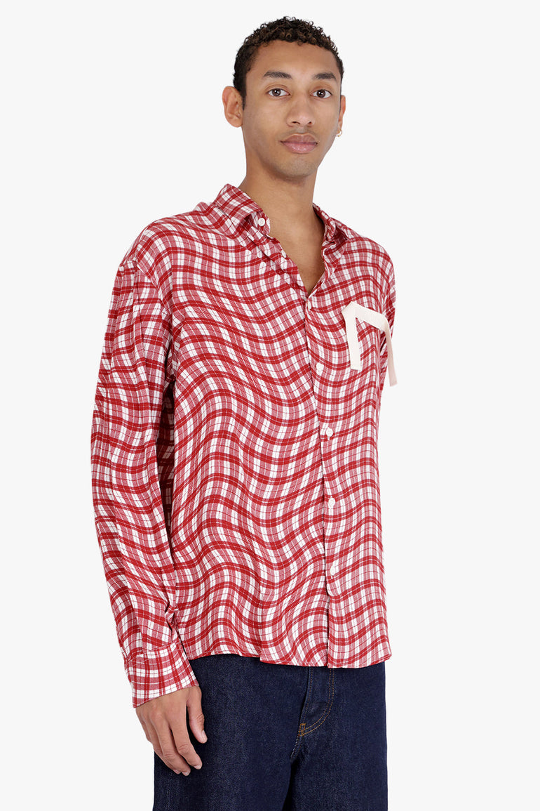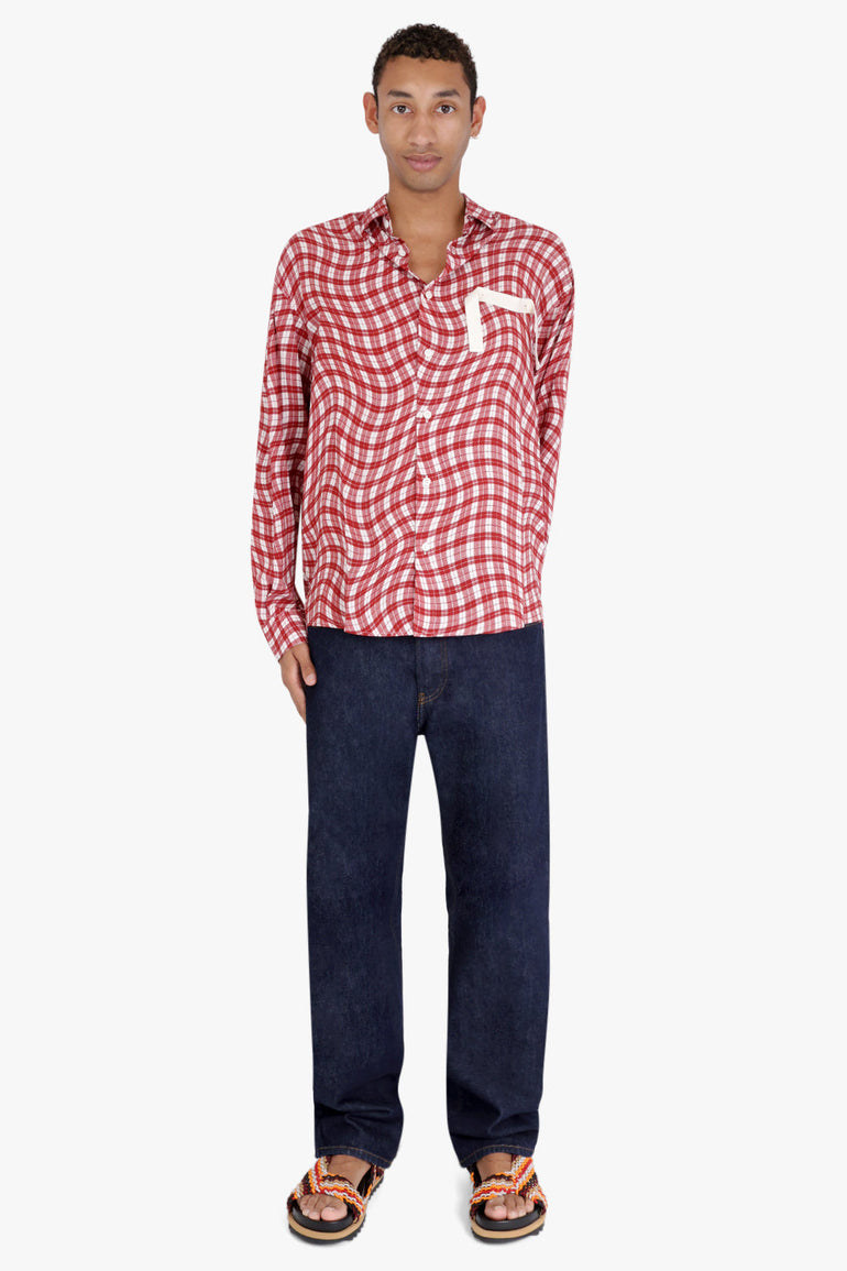 La Chemise Simon Crafted from wavy checked viscose fabric, it features a straight fit, pointed collar, removable grosgrain logo ribbons on the chest, button placket, and square cuffs with mother-of-pearl buttons. The subtle dark red deform check pattern elevates any look.