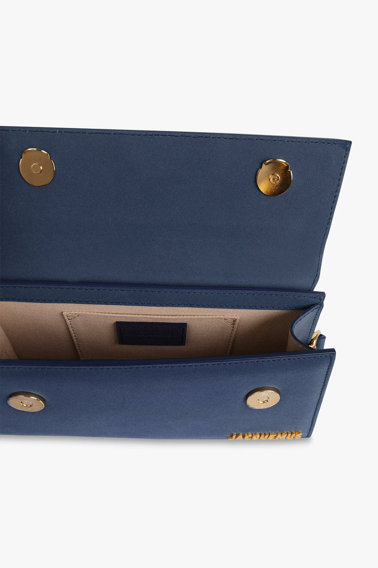 The Jacquemus Le Chiquito Long Leather Bag in Dark Navy is crafted from calf leather, featuring a round top handle, a detachable and adjustable shoulder strap, a fold over top with magnetic closure and a main internal compartment and a gold-tone logo plaque.