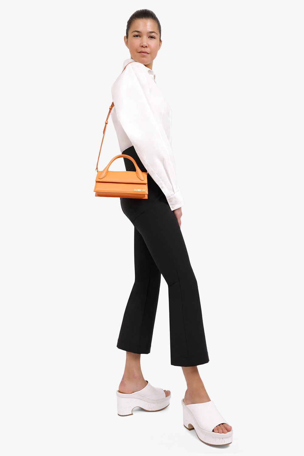 橙色的Jacquemus Le Chiquito Long皮革包由Calf Nubuck皮革制成,具有圆顶手柄,可拆卸可调节肩带,折叠顶部,磁性封盖和主要内部隔室和金色标志斑块。