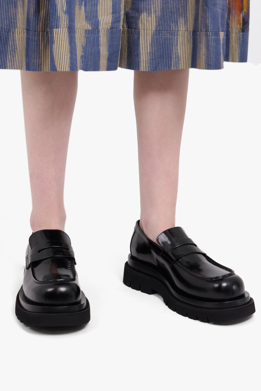 The Bottega Veneta black loafers, created by Matthieu Blazy, feature a smooth leather design with an exaggerated square toe and lug rubber sole, showcasing masterful proportions.