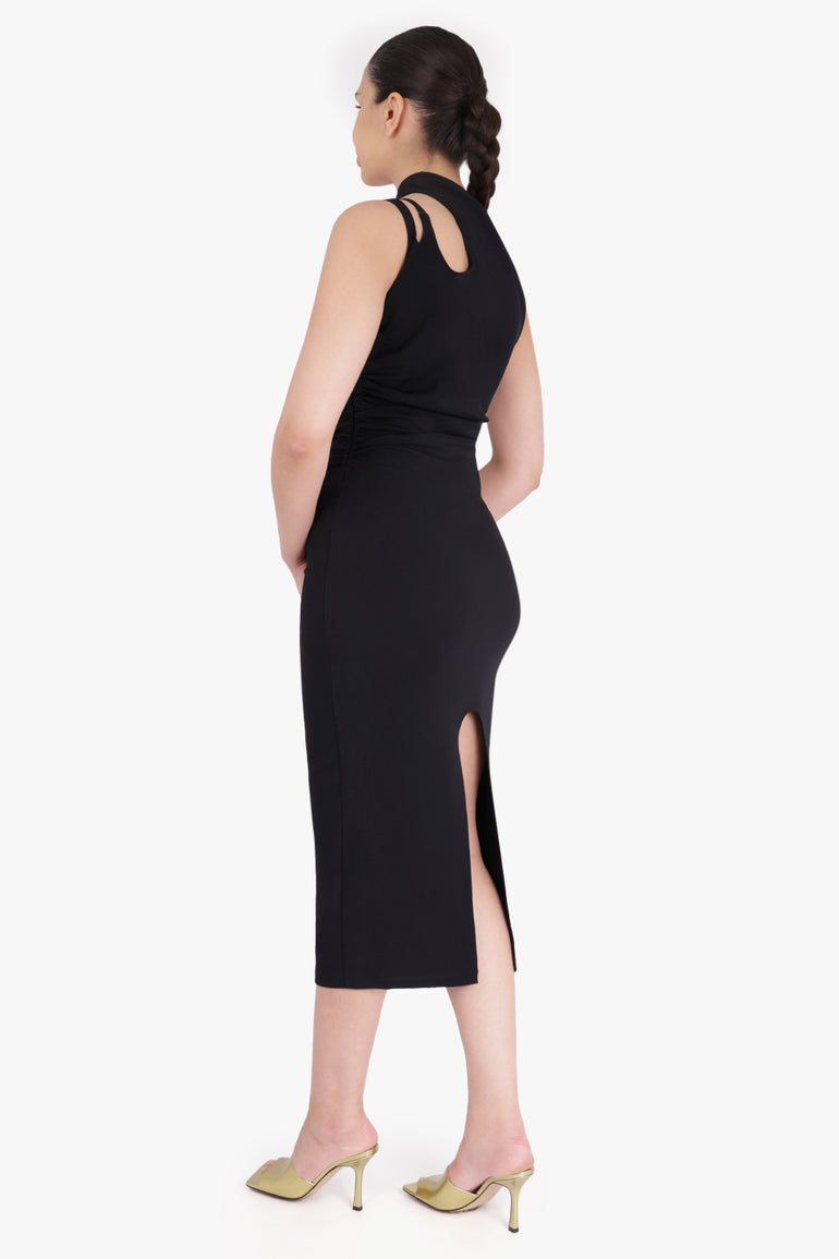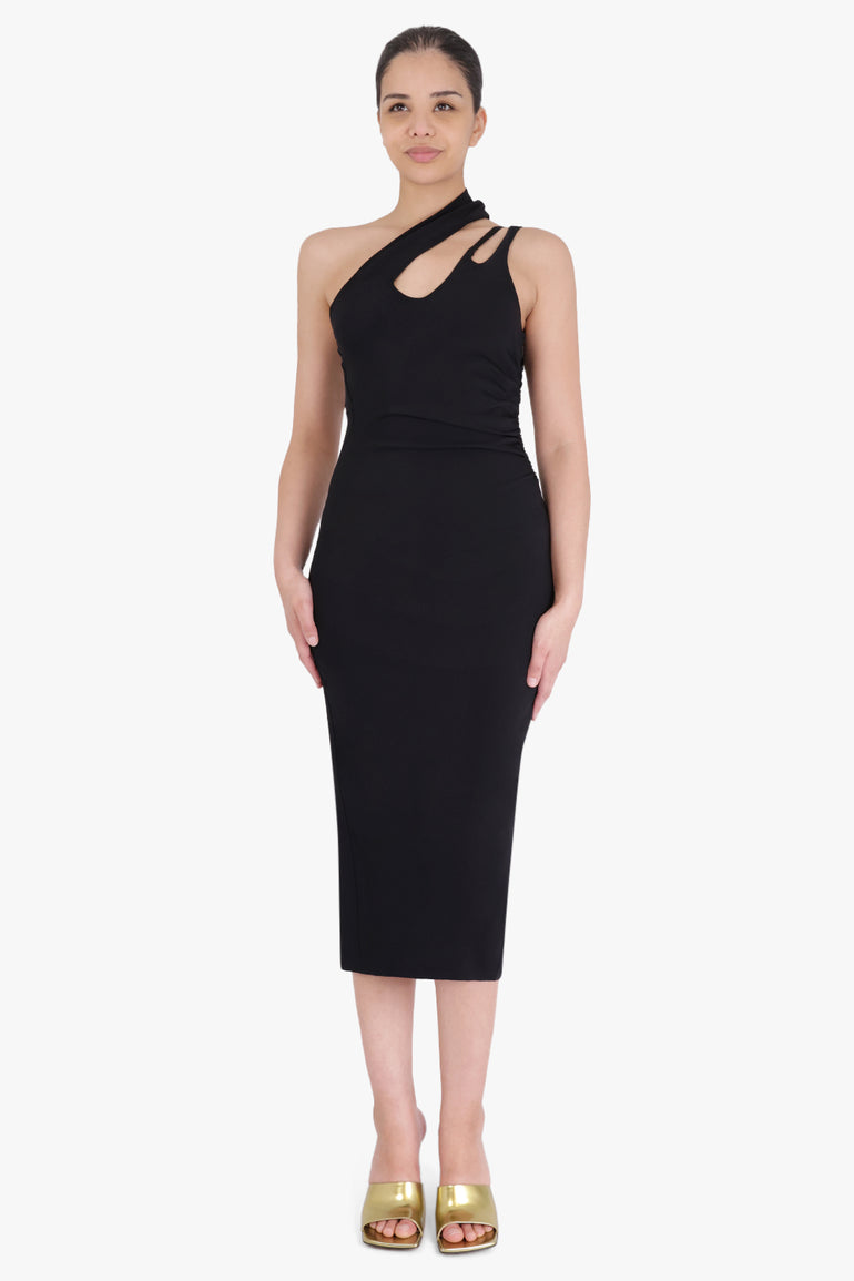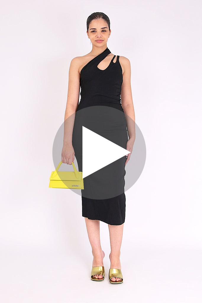 Mugler's One Shoulder Dress has a unique silhouette, with two thin straps and one thick strap on the same shoulder, plus a stretchy fabric for added comfort and shape. The dress is finished with a slit at the back.