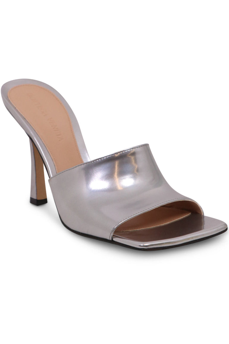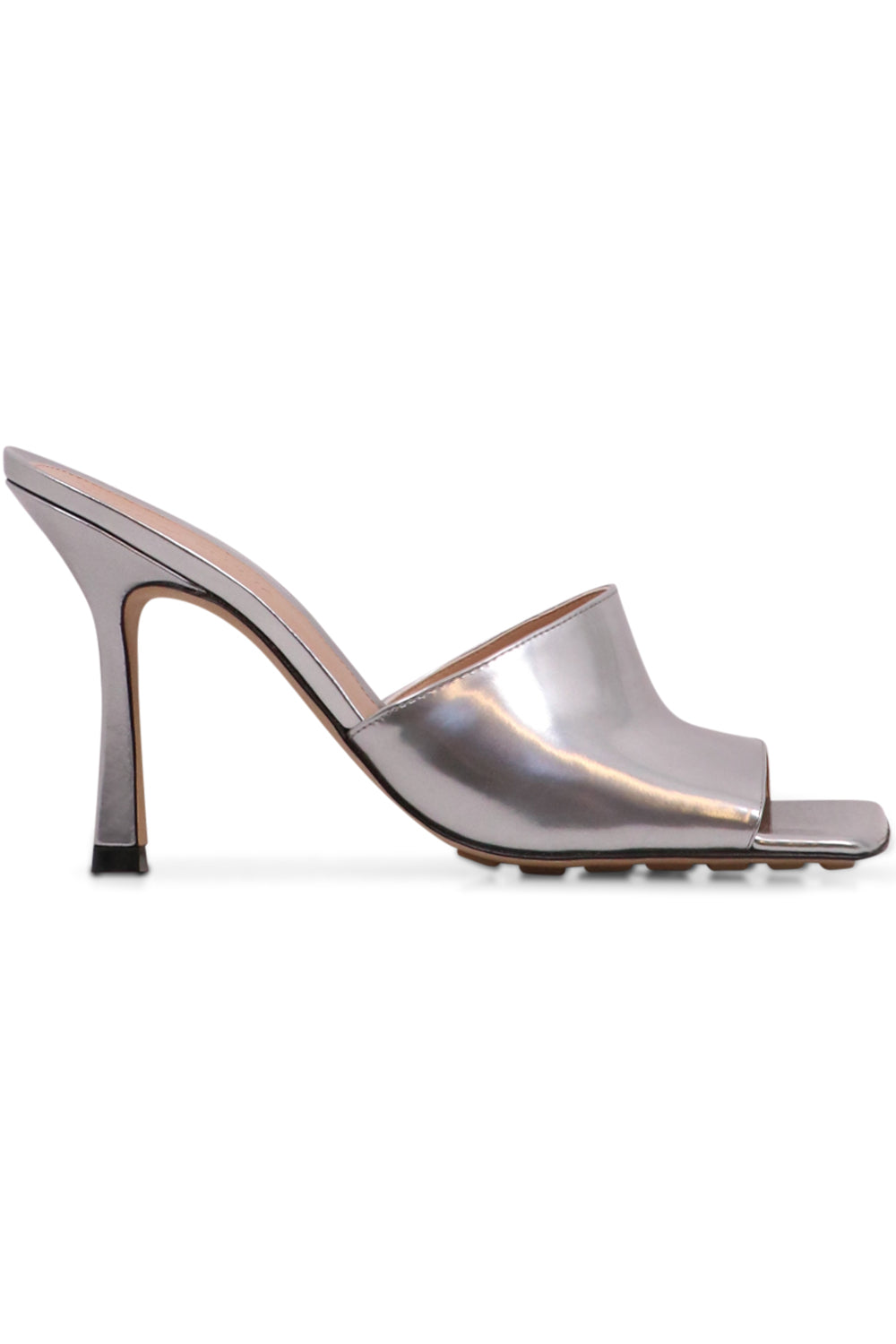 The Bottega Veneta Stretch Mule in Mirror Silver is crafted from a smooth lambskin leather. The shoes feature the Bottega Veneta signature square toe and a slip on design.