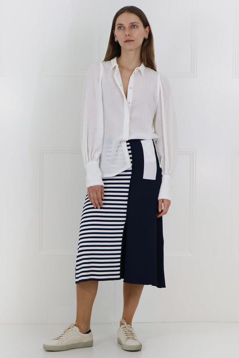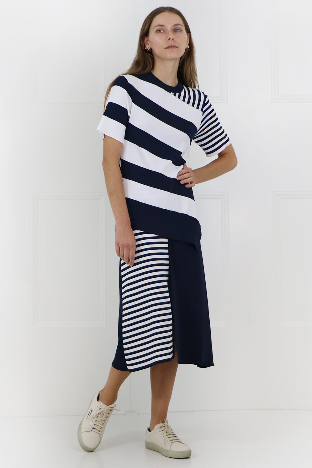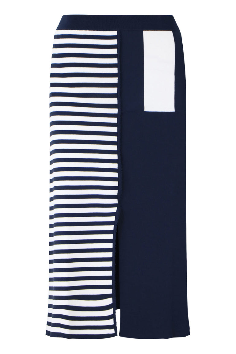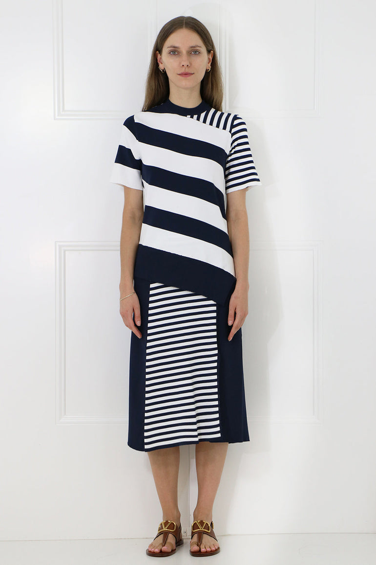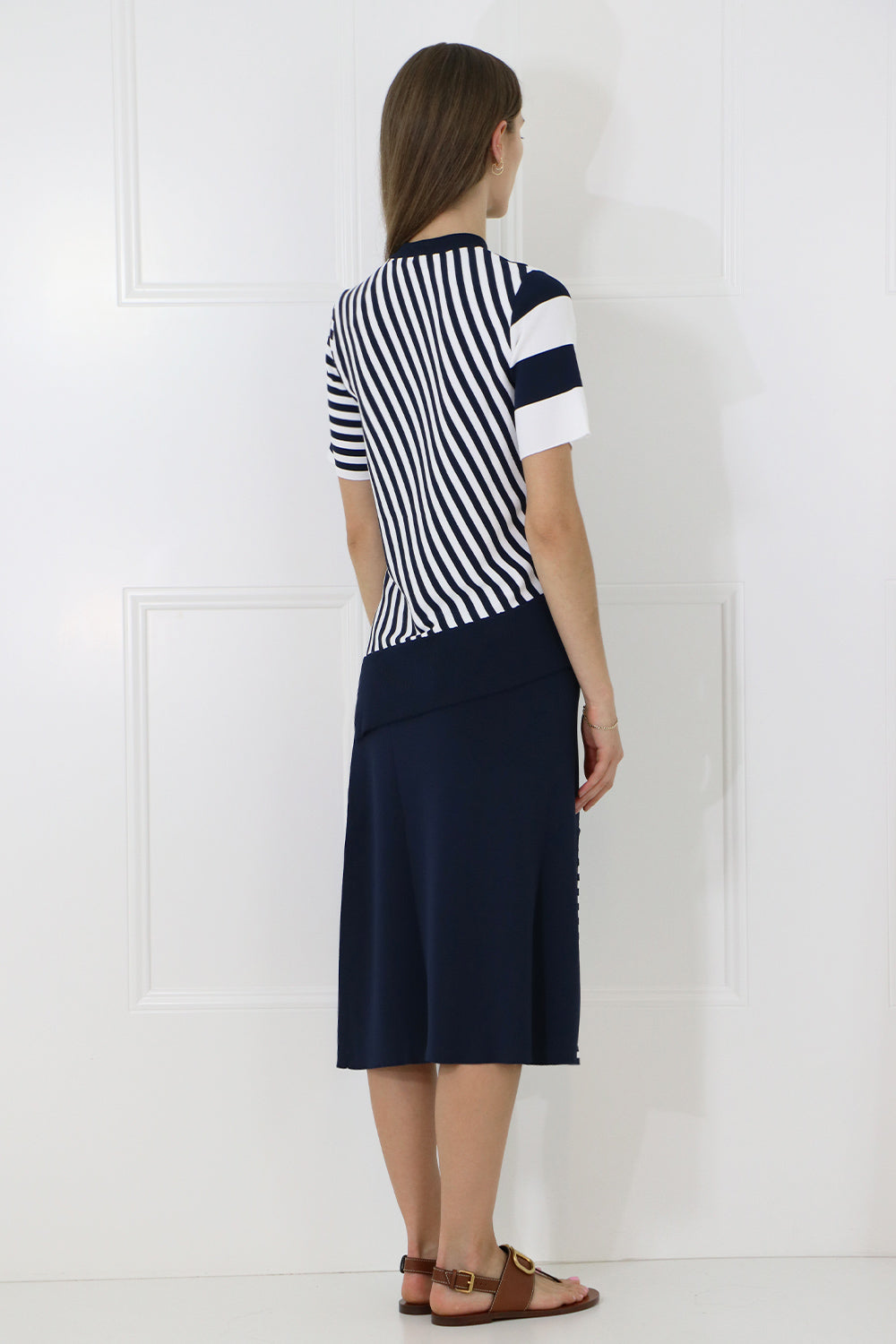 CEDRIC CHARLIER RTW ASYMMETRIC STRIPE KNIT SKIRT NAVY/WHITE