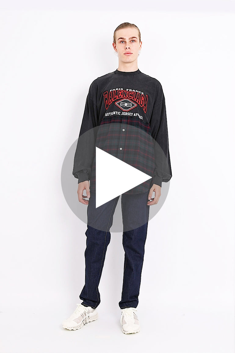The Balenciaga Patched L/S T-Shirt is crafted from two panels assembled together, with a vintage jersey t-shirt top section and a cotton check flannel bottom section. This style is an oversized fit and features a B Authentic artwork embroidered at the front, a rounded bottom hem, long sleeves and a crew-neck with distressed details at the collar.