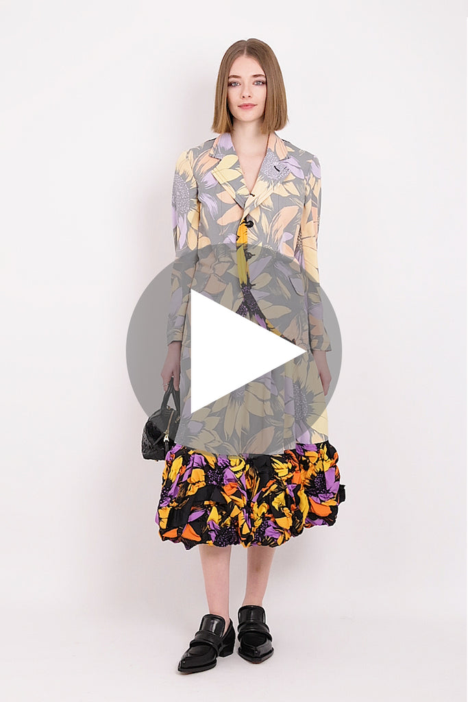 The Comme Des Garçons Contrast Detail Floral Print Blazer Jacket is crafted in a polyester crepe material. The style is transformable, between a button up jacket and a blazer style and features a contrast thick lapel and back panel detail.