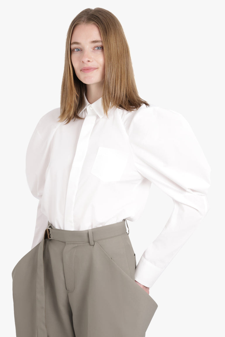 The shirt features a collar neckline, straight fit, and white fabric. It has a hidden centre front button closure and a single breast pocket. The exaggerated balloon sleeves taper down to the cuff and have a button closure. A centre back pleating adds detail to the design.