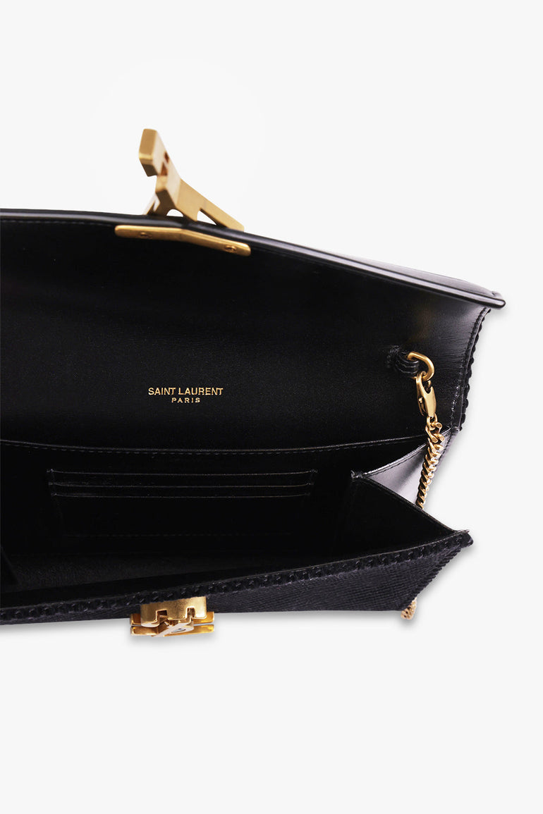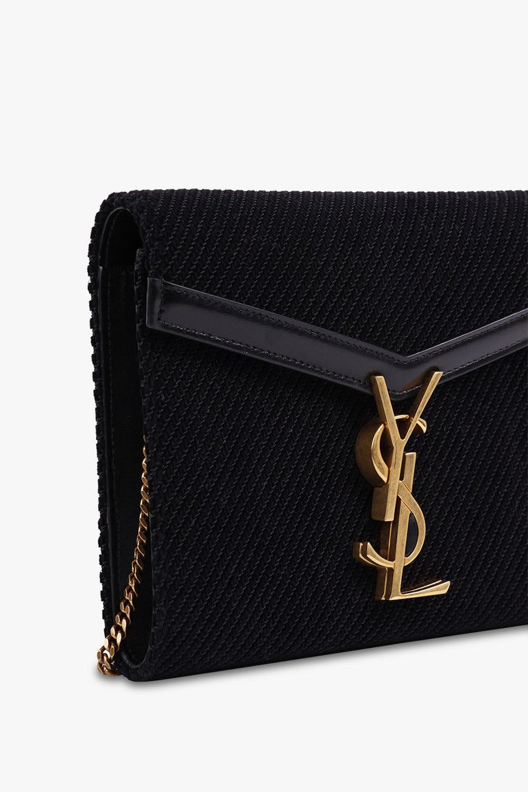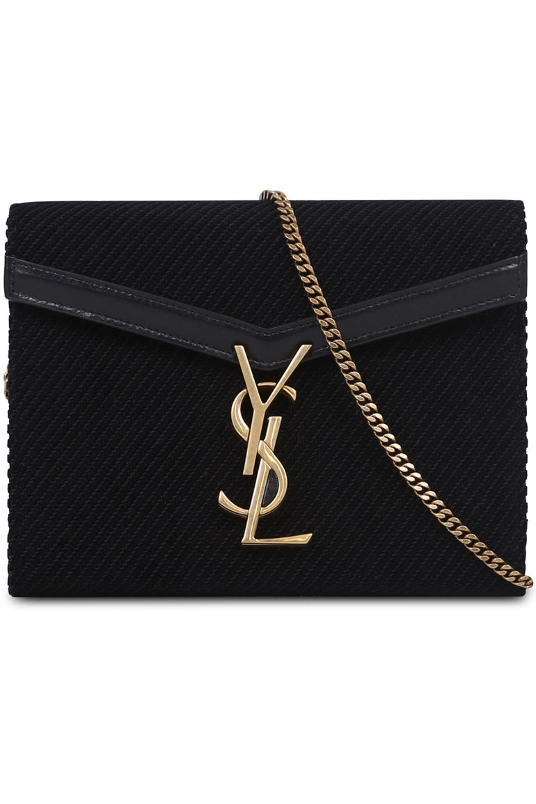 The Saint Laurent Cassandra Wallet on Chain Bag features a textured velvet fabrication, monogram YSL logo and magnetic snap fastening. A very versatile stylish clutch or evening bag!