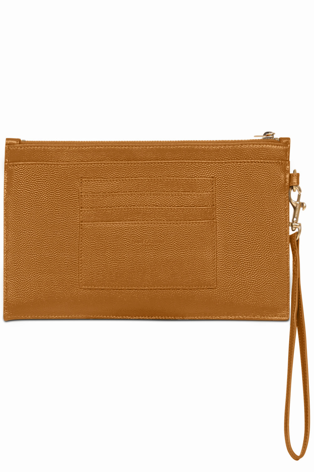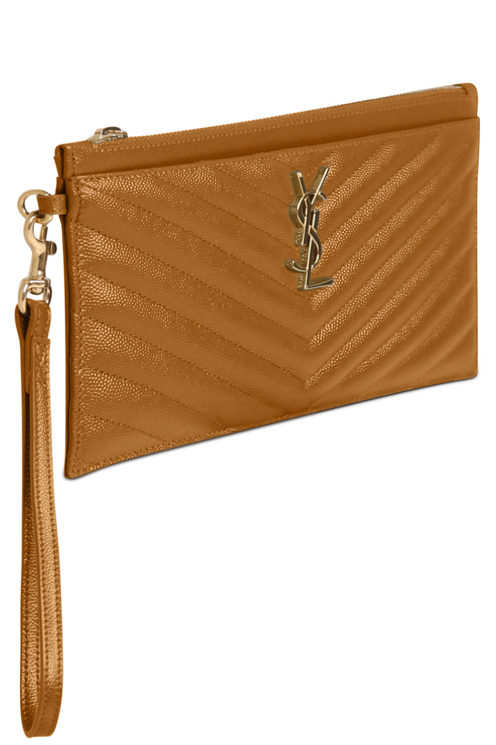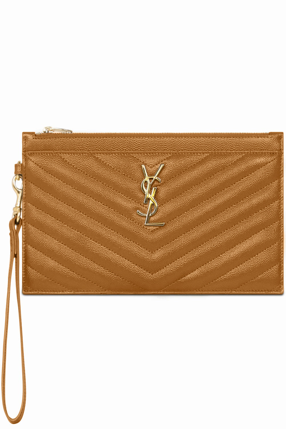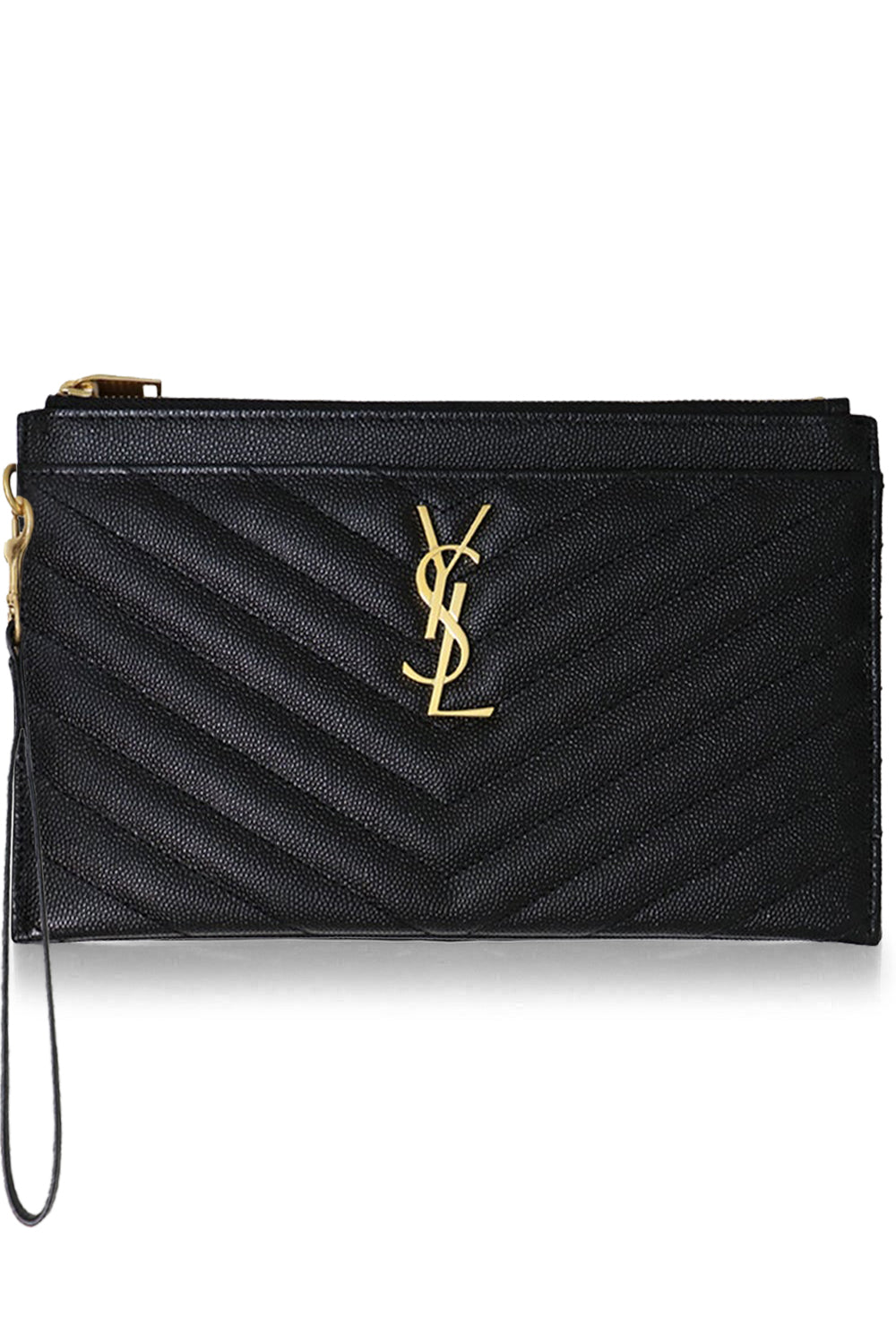 The Saint Laurent Large Monogramme Bill Wristlet Pouch is a zip clutch adorned with interlaced YSL logo at the centre in gold hardware, in quilted grained calfskin leather. It features card slots at the back and a zipper opening, with a removable wristlet strap.