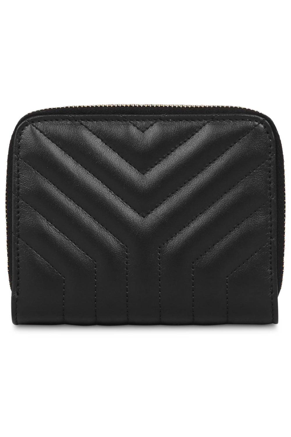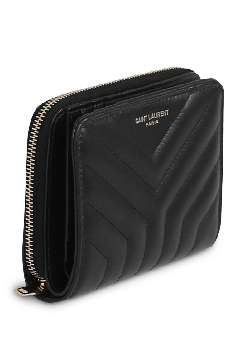 The Saint Laurent Monogramme Quilted Zip Wallet in Black is fabricated from leather and features gold hardware. This style features a logo print centered at the top of the front, all around zip fastening, internal card slots, a note compartment and a concealed press-stud fastening.