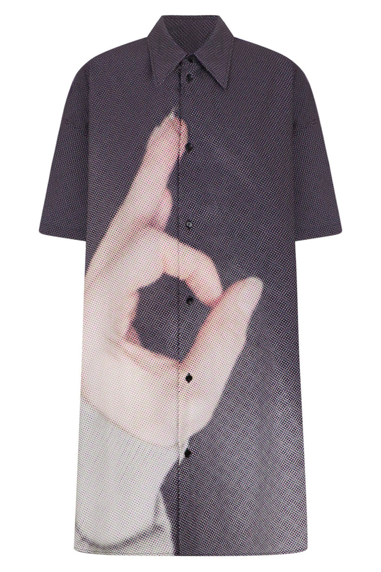 The MM6 Maison Margiela 6 Hand Print Shirt Dress is crafted from cotton poplin and features a pixelated print displaying a hand in a '6' sign, a nod to the label's name. This dress is oversized and boxy and features a pointed collar, short sleeves, pockets on either side and buttons down the front.