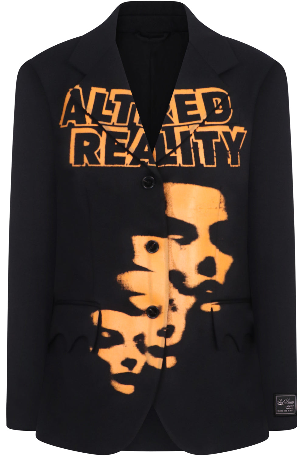 The Raf Simons Altered Reality Oversized Blazer is crafted from synthetic cotton, and is a boxy fit. This style features a graphic across the front, pointed lapels, buttons down the front, scallop flap pockets and a patch logo on the sleeve.
