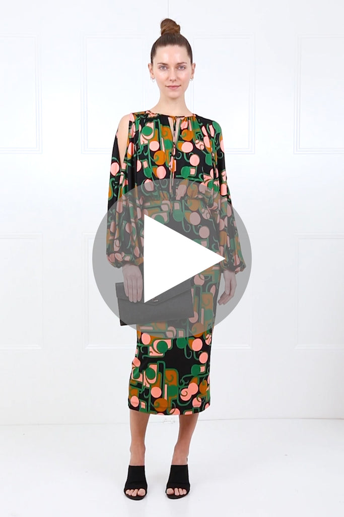 La Double J Decho Print Aphrodite连衣裙采用绿色制成,采用粗体打印设计的流体泽西面料。这件衣服采用袖子肩部暴露狭缝, 带有后拉链的弹性腰部和前套环的系带。