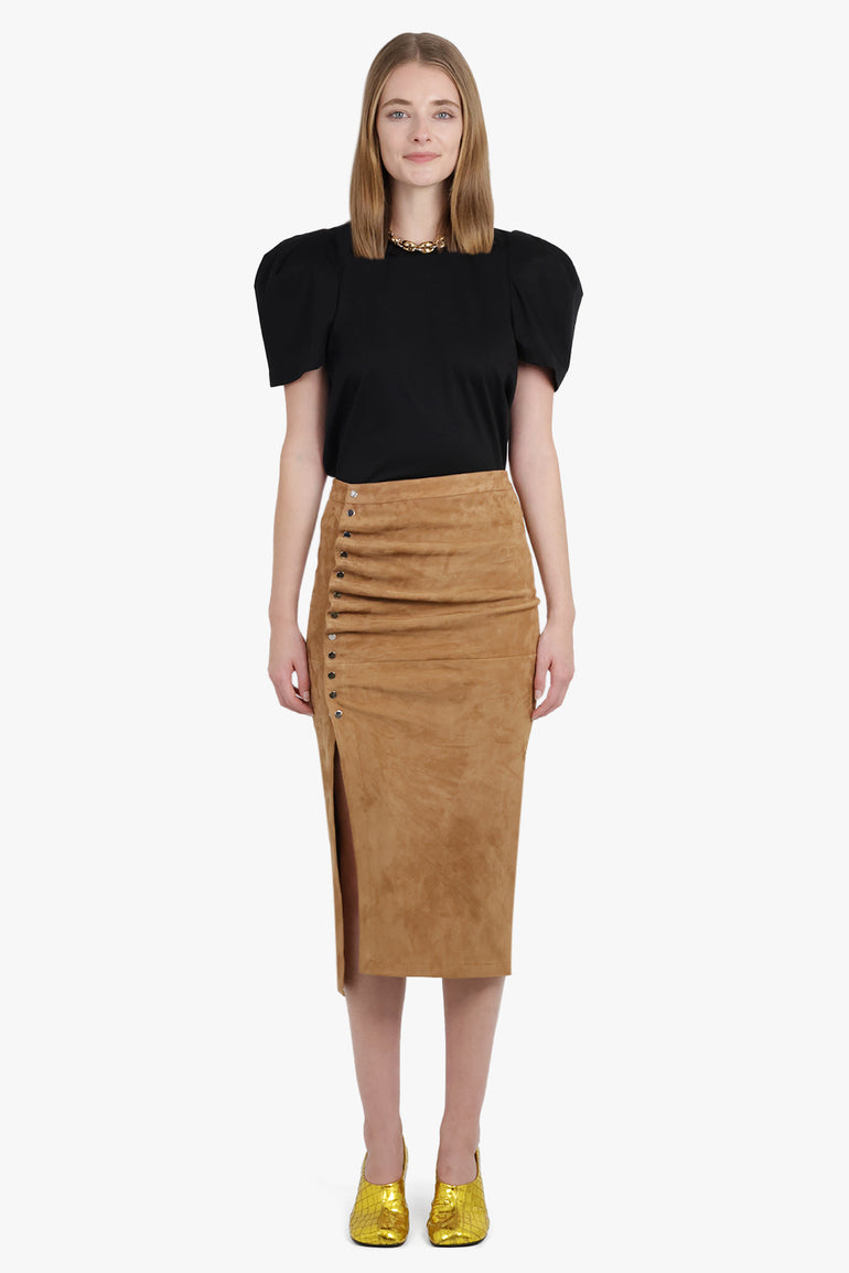 RABANNE RTW Asymmetric Ruched Leather Midi Skirt | New Caramel