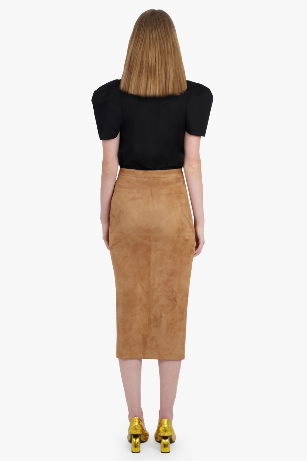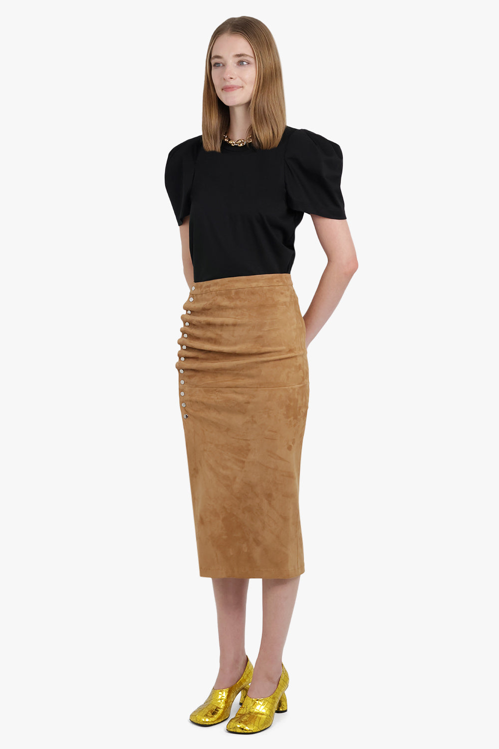 Asymmetric Ruched Leather Midi Skirt | New Caramel