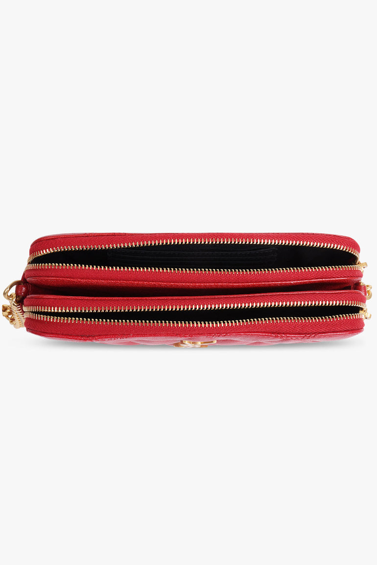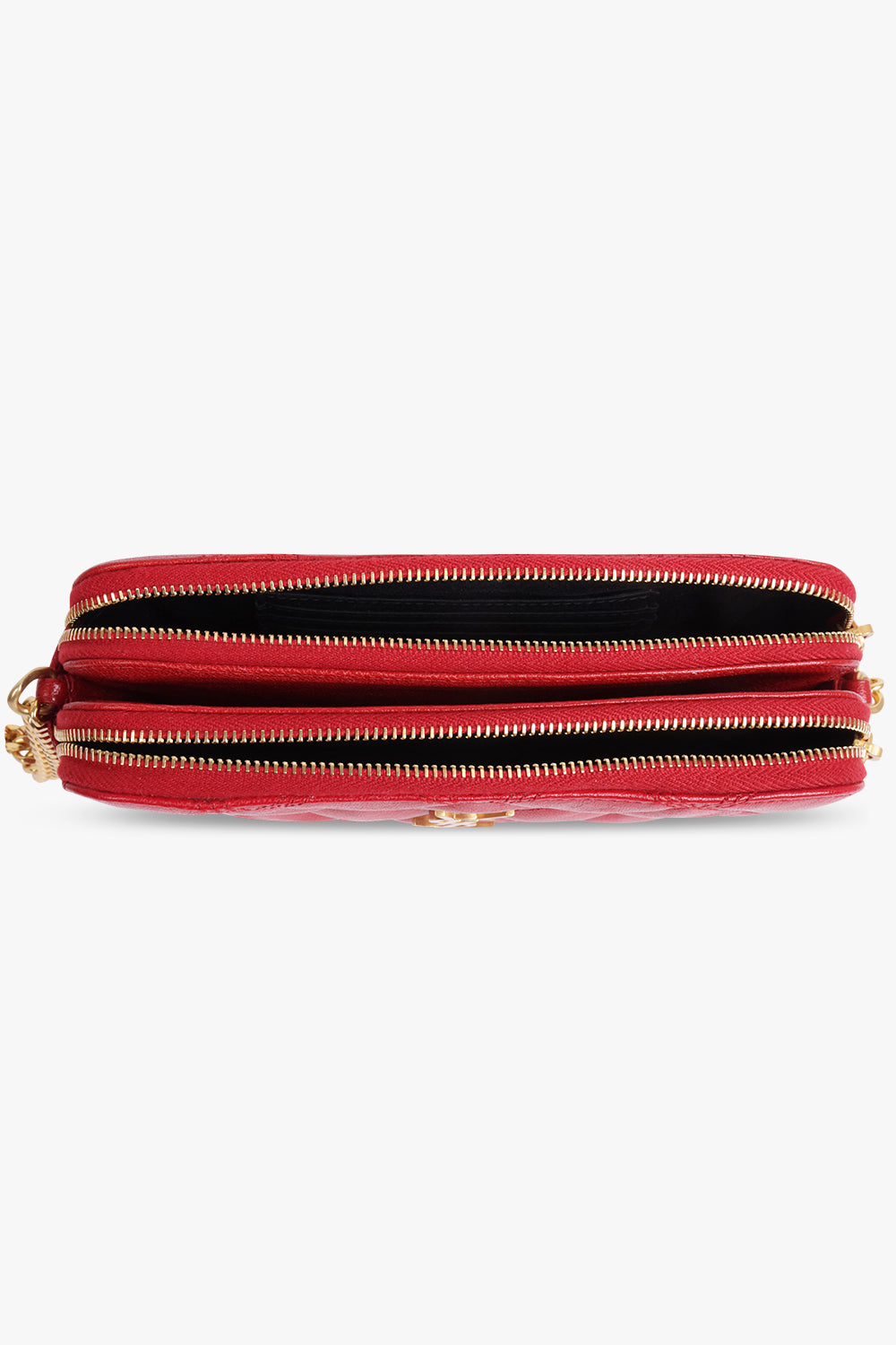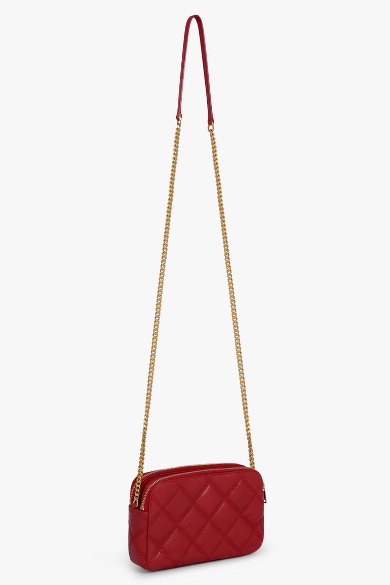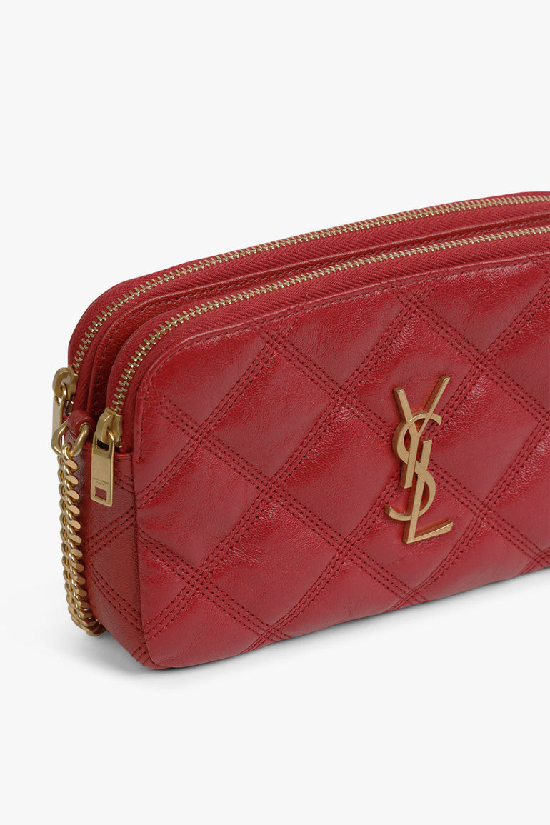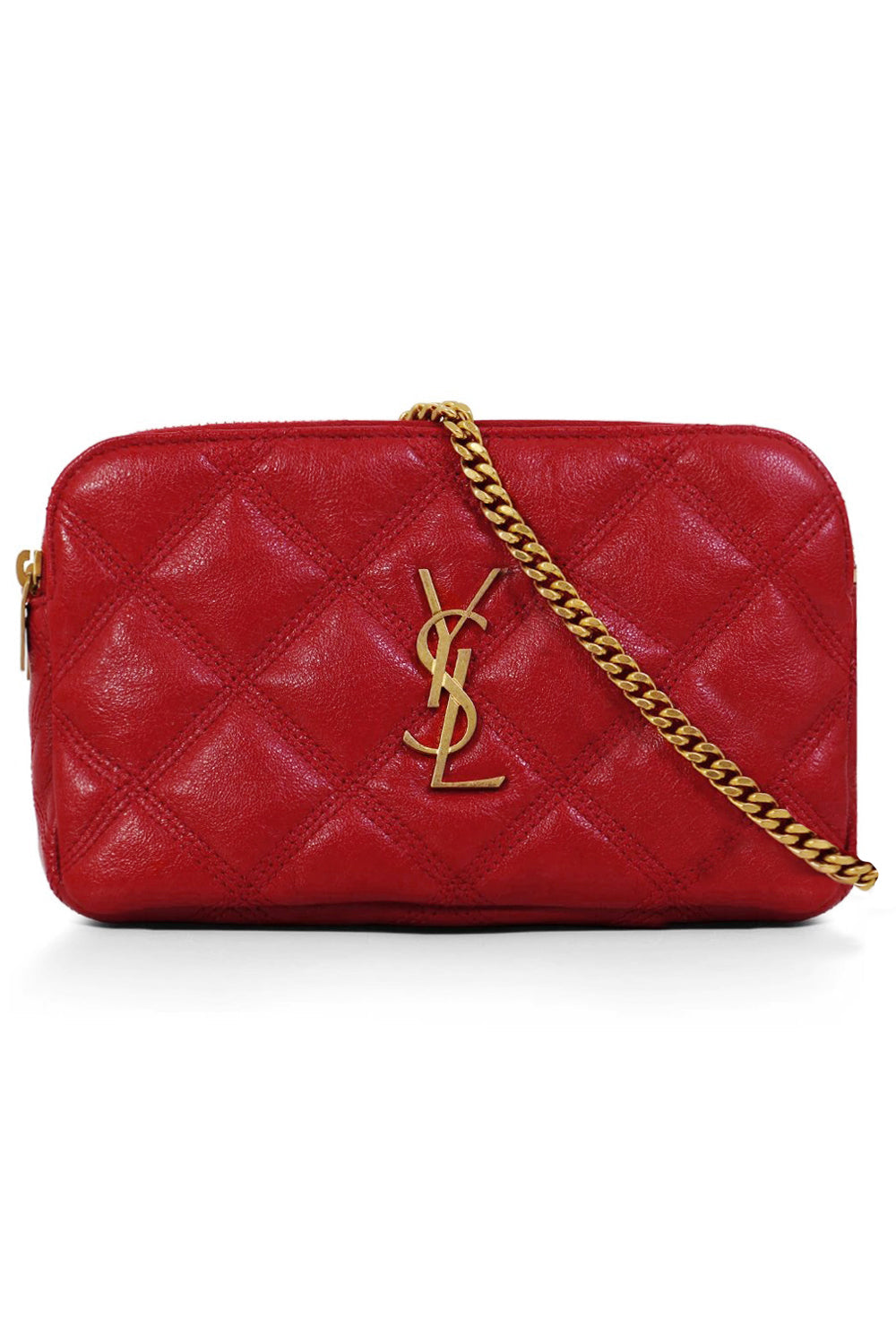 Saint Laurent Becky Double拉链斜挎包在Rouge Eros 采用绗缝双拉链袋装饰有金属YSL首字母,链条和皮革皮带。内部有两个拉链隔室,一个平板,四个内卡槽和肩带滴。