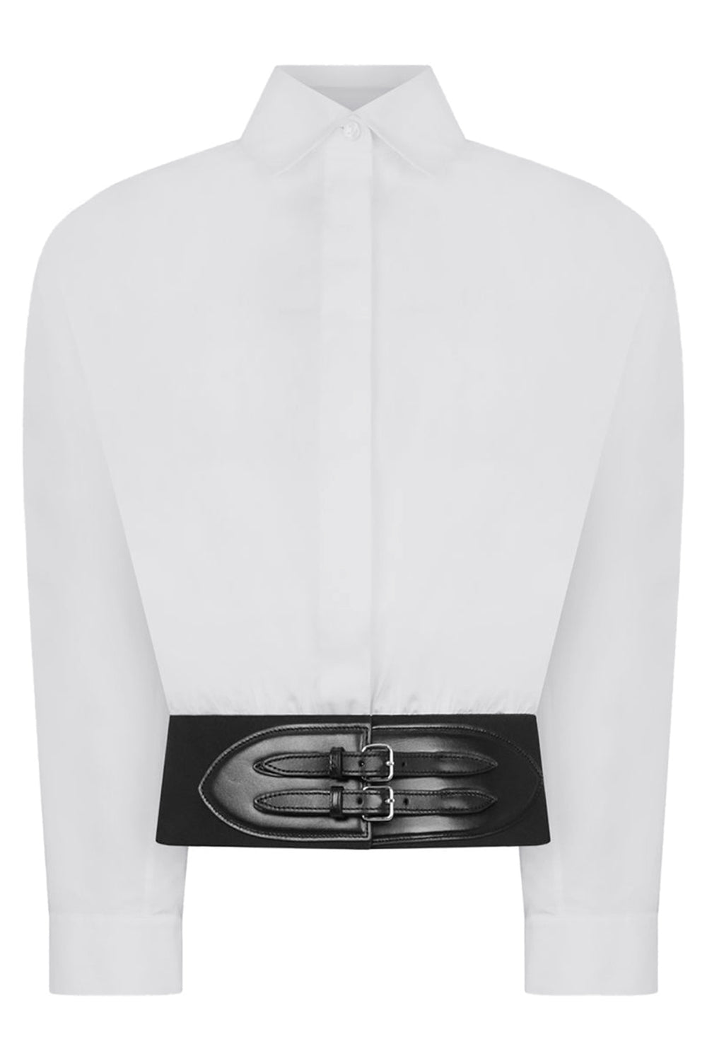 The Alaïa Belted Shirt is a button down poplin shirt crafted from Japanese poplin, ending in a black stretch belt at the wearer's waist, with a front button placket, cuffs and crisp shirt collar.