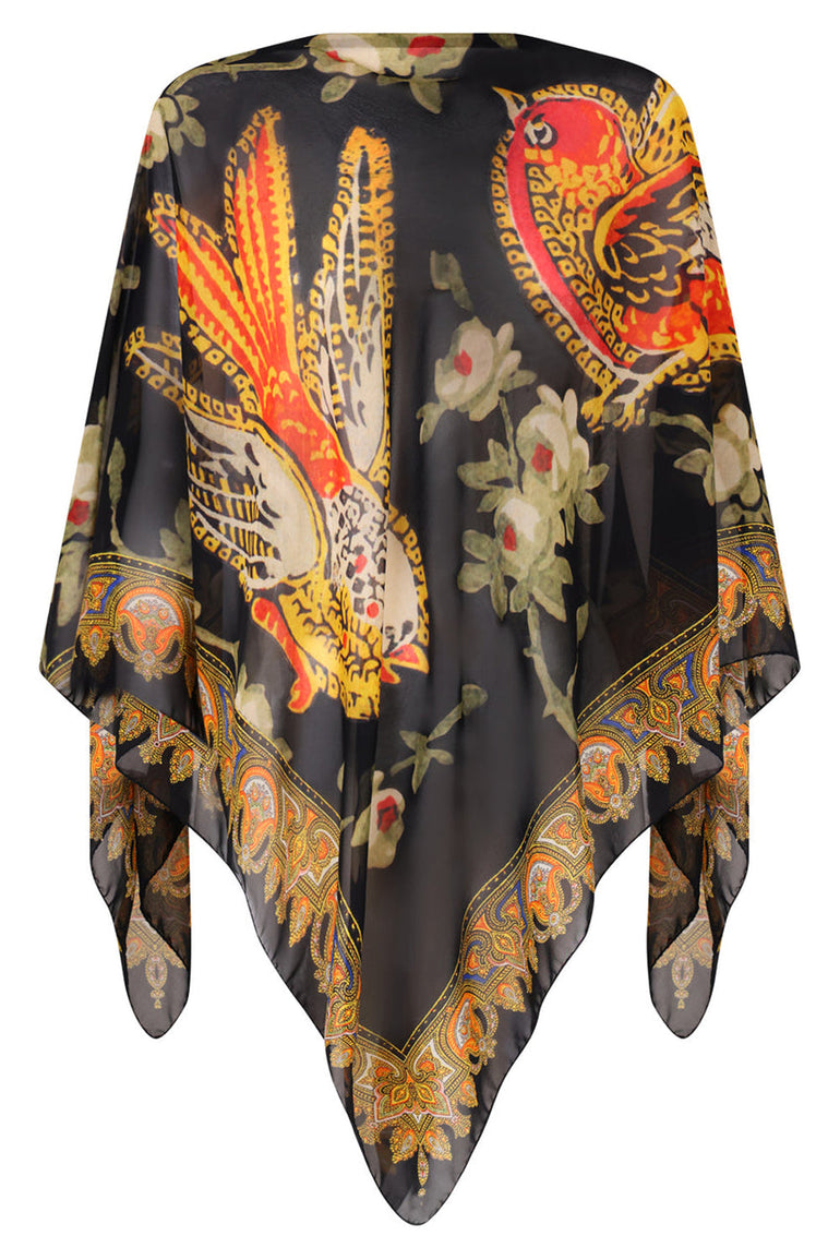 BIRD PRINT GEORGETTE PONCHO | BLACK