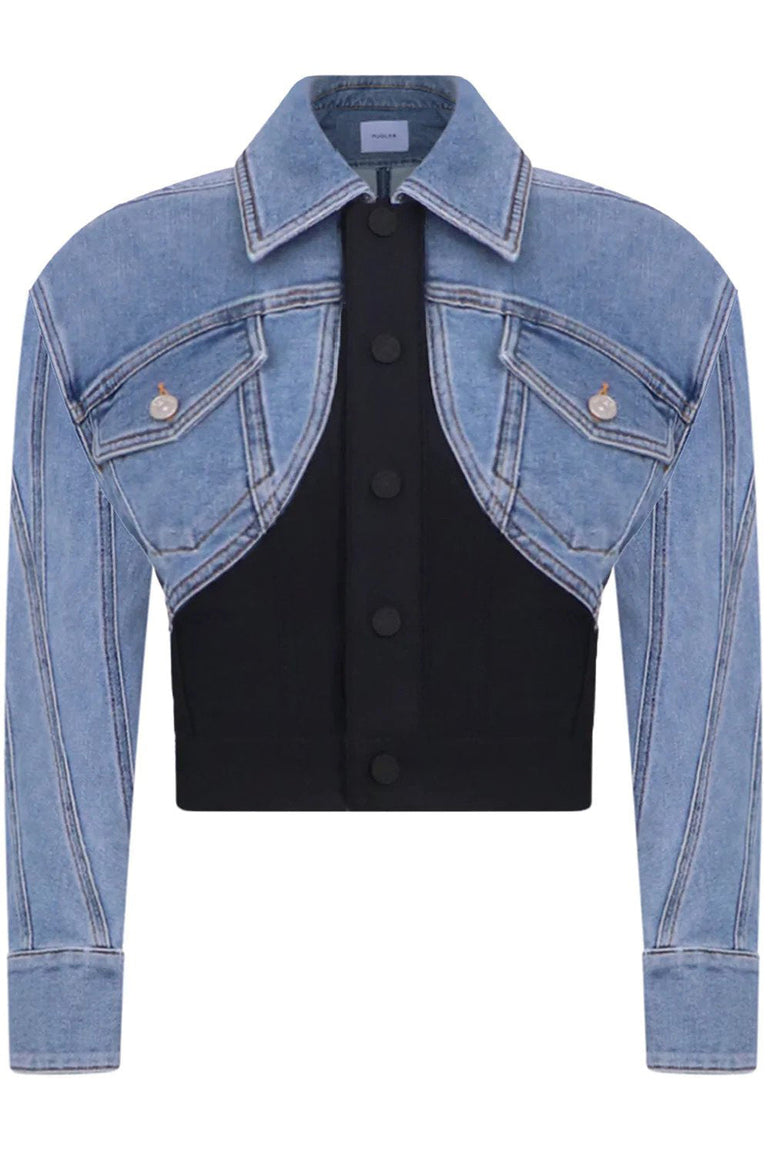 MUGLER RTW CROPPED BI-MATERIAL DENIM JACKET | BLUE/BLACK