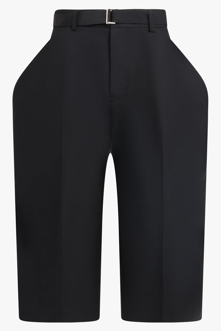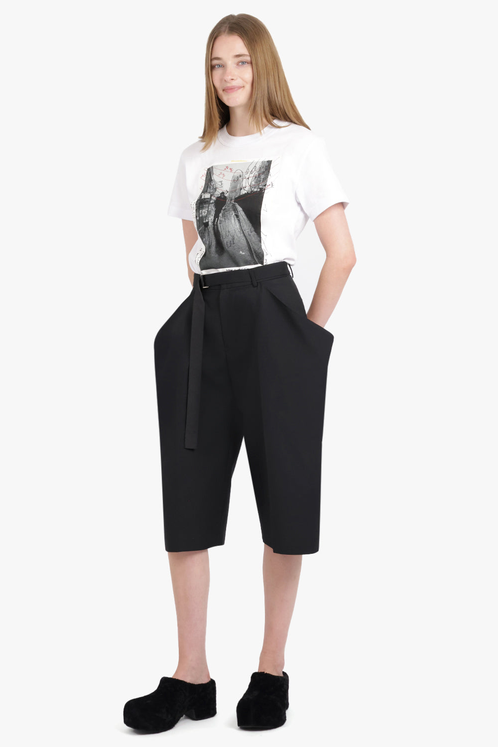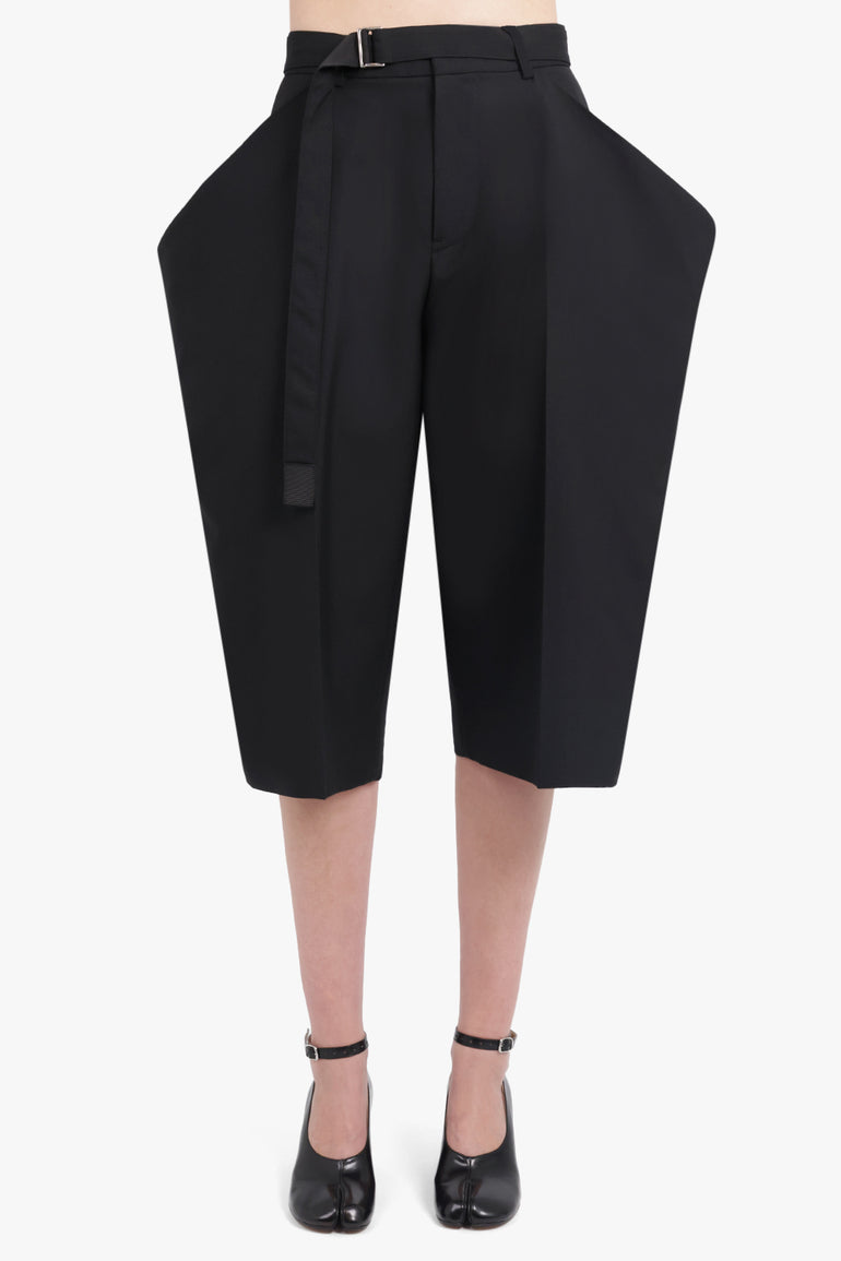 This product features a waistband with belt loops, a center front fly zip opening, exaggerated side pockets with folded over sides, an attached adjustable belt, and back pockets with button closures.